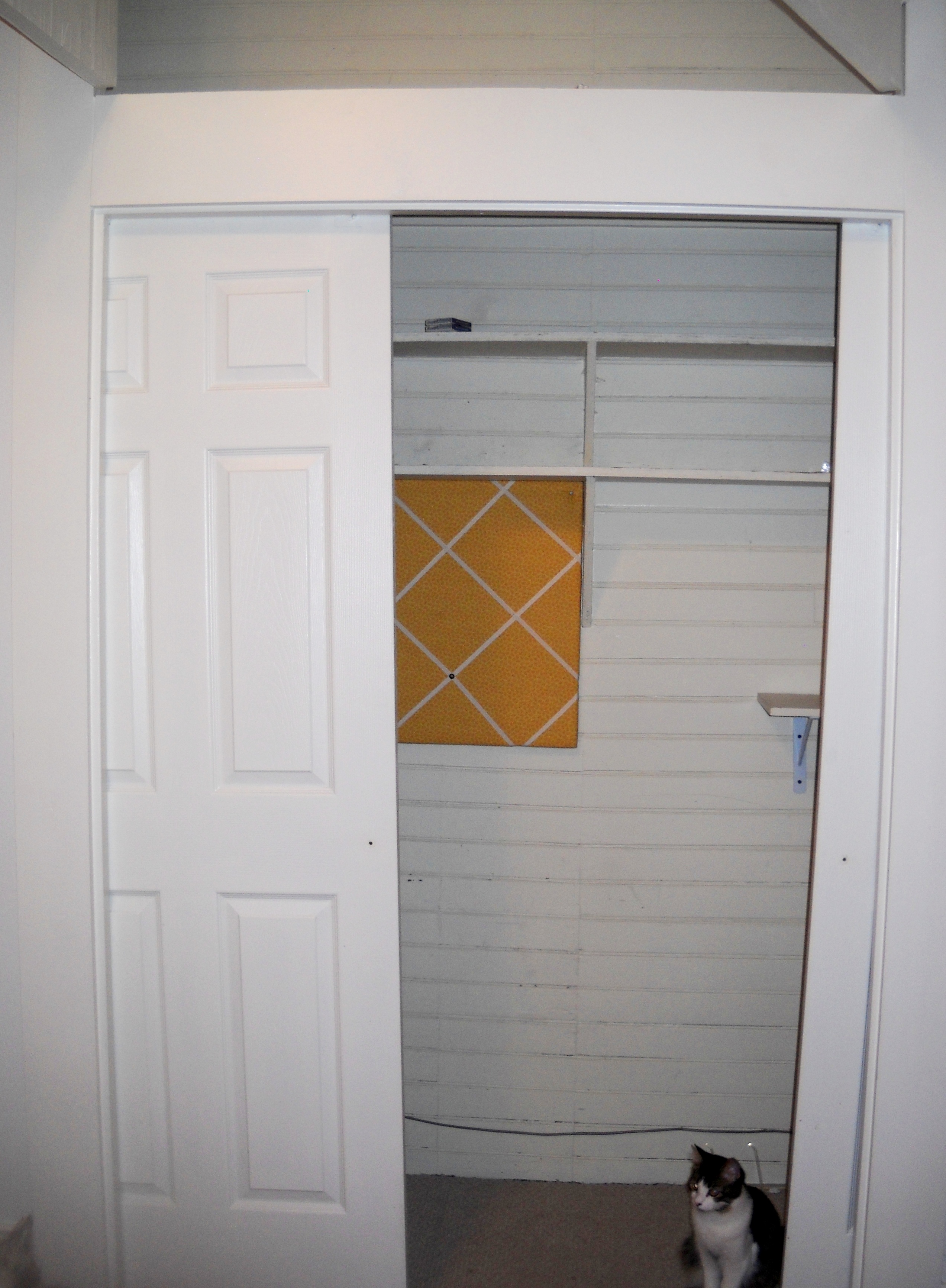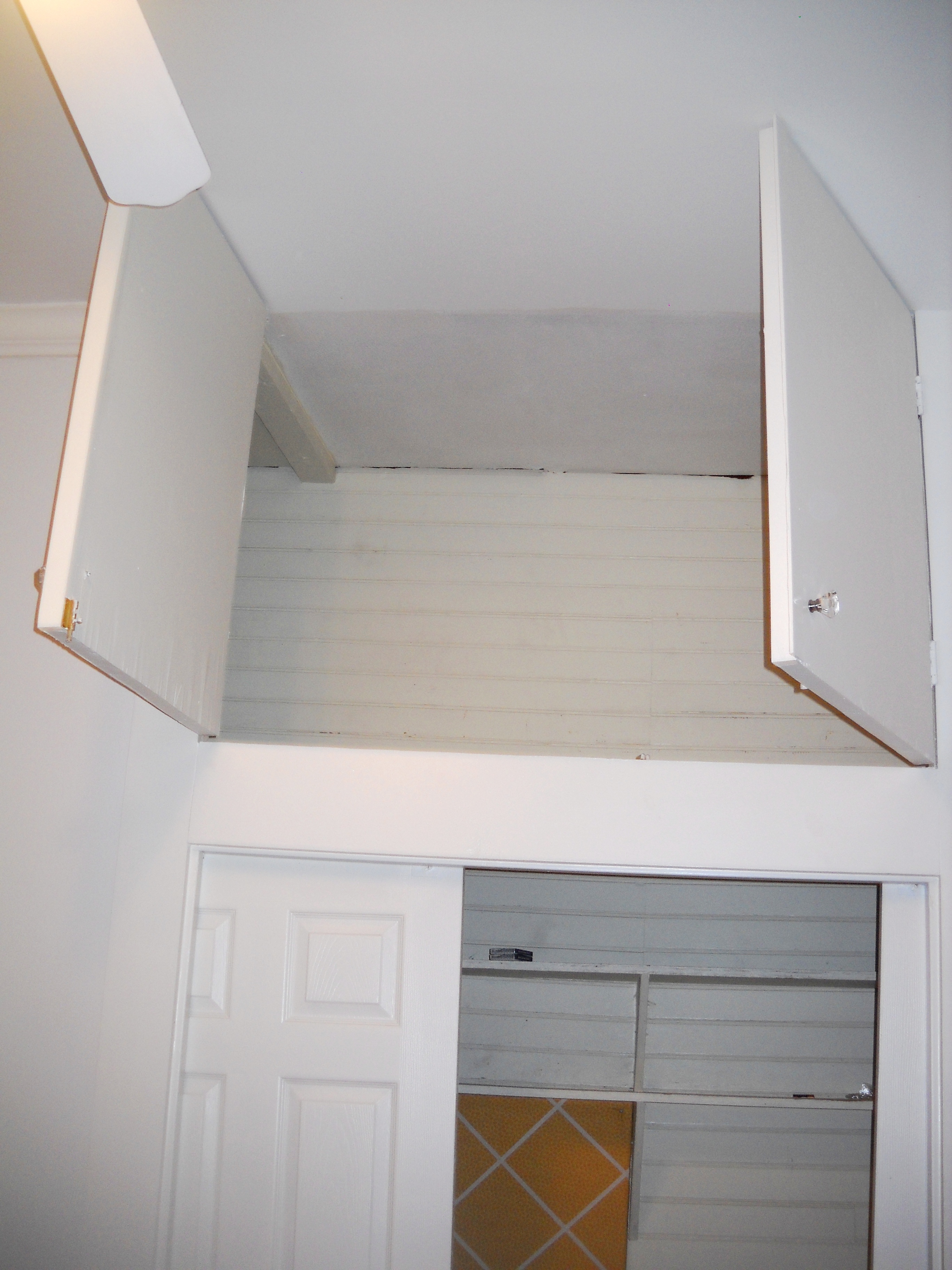 The small closet can be seen in the picture to the left. There is also a cabinet above to take advantage of the full height of the 12 foot ceilings.