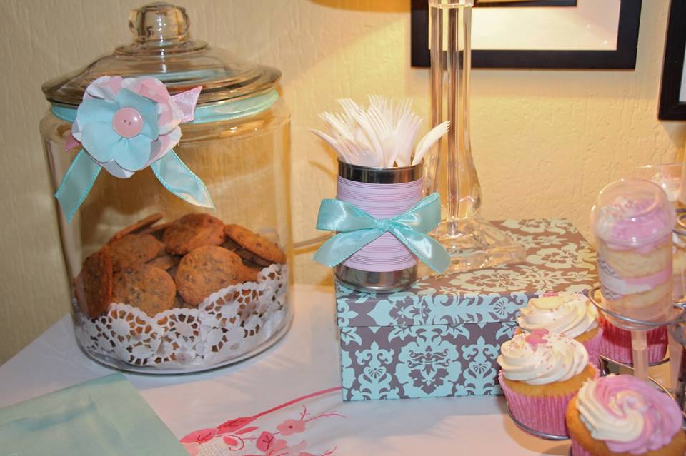 My main gift was an Ikea style reclining rocker that I styled up for the shower with some custom-made pillows as a place for Momma to sit and unwrap her gifts. I added a few thrift store finds like this cute little wooden table and the palest pink lampshade which I embellished with some fabric flowers, so girlie! I use a set of grey and aqua covered boxes around the room as decor and risers for the treat table which can then be used to store all those little baby items you need in a nursery. On the front door I hung a cute vintage print (also from the thrift store) which might remind us how the baby got here in the first place. A framed invitation is also a great item to add as decor that can then be hung on the wall later and of course lots and lots of bunting.