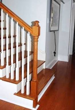 I am quite proud that I put a red stain, on the railing only, of my builder stairs. But I had not even thought about getting rid of those wooden balls! Hmmmm…