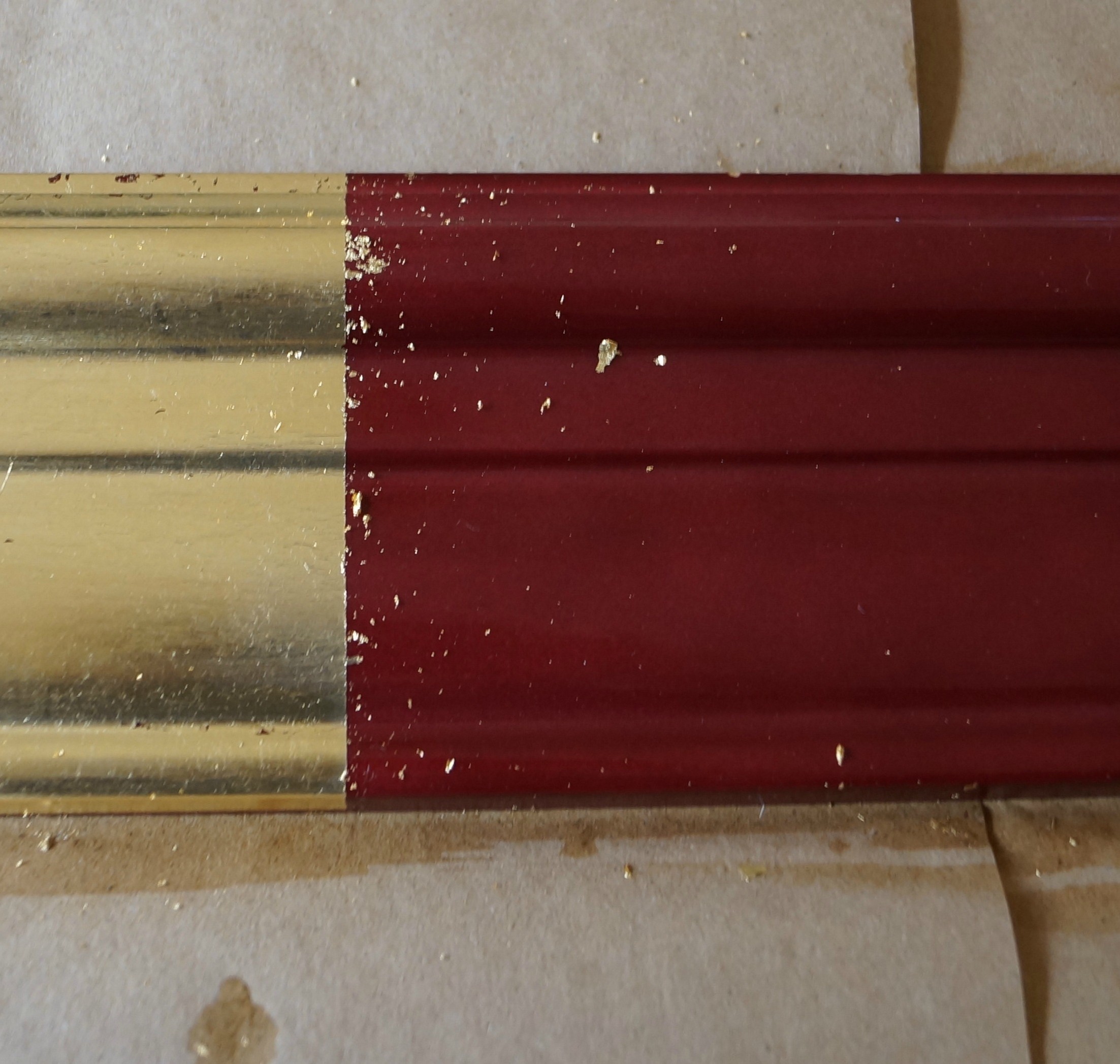 At the start the frame was red so it needed little work. I’m using a lot of gold accents in the new room and since gold leaf works perfectly over red I thought it would be a great update for this frame.