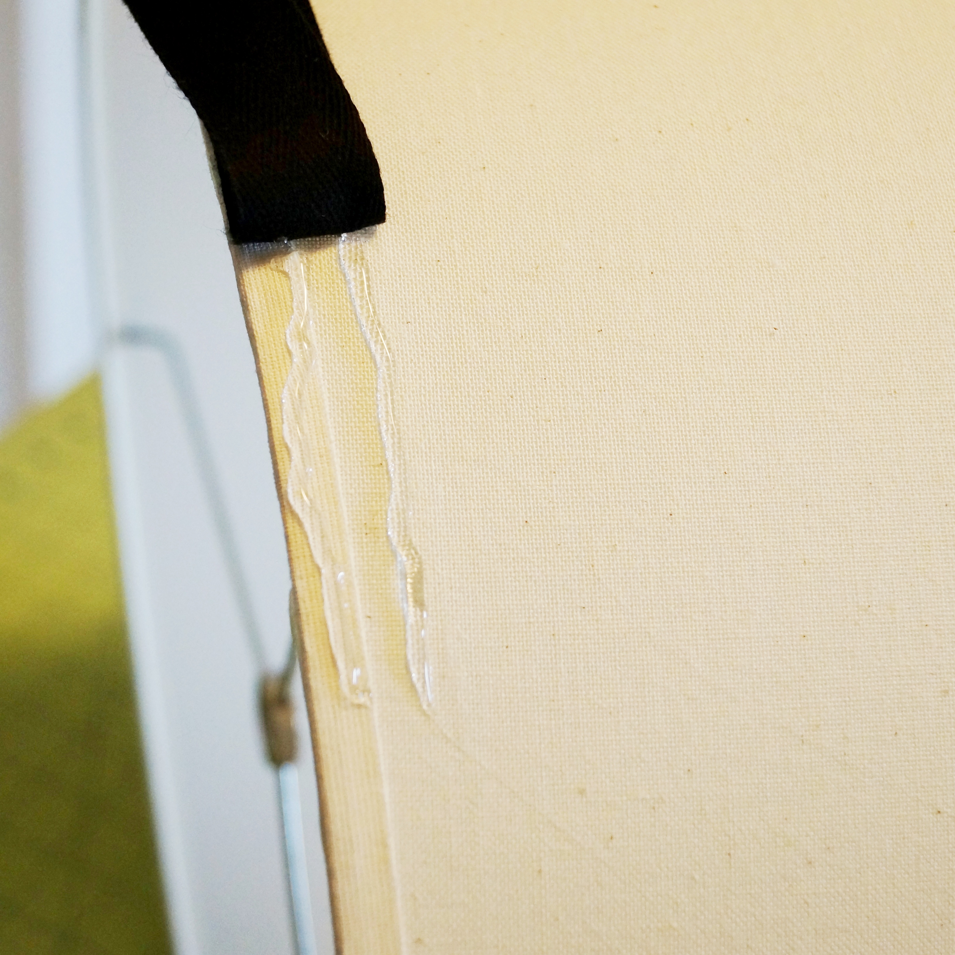 The process is very simple. Start by gluing the end of the ribbon at the seam of the shade. Then add glue a few inches at a time adhering the ribbon along the edge if the shade. Continue around until you cone back to the seam cutting the ribbon about 1/2″ past the seam. Glue the end of the ribbon under so it doesn’t fray then glue it down so it over laps the raw edge of the ribbon where you started. Do the same at the opposite edge of the shade. Here are the steps in photos.