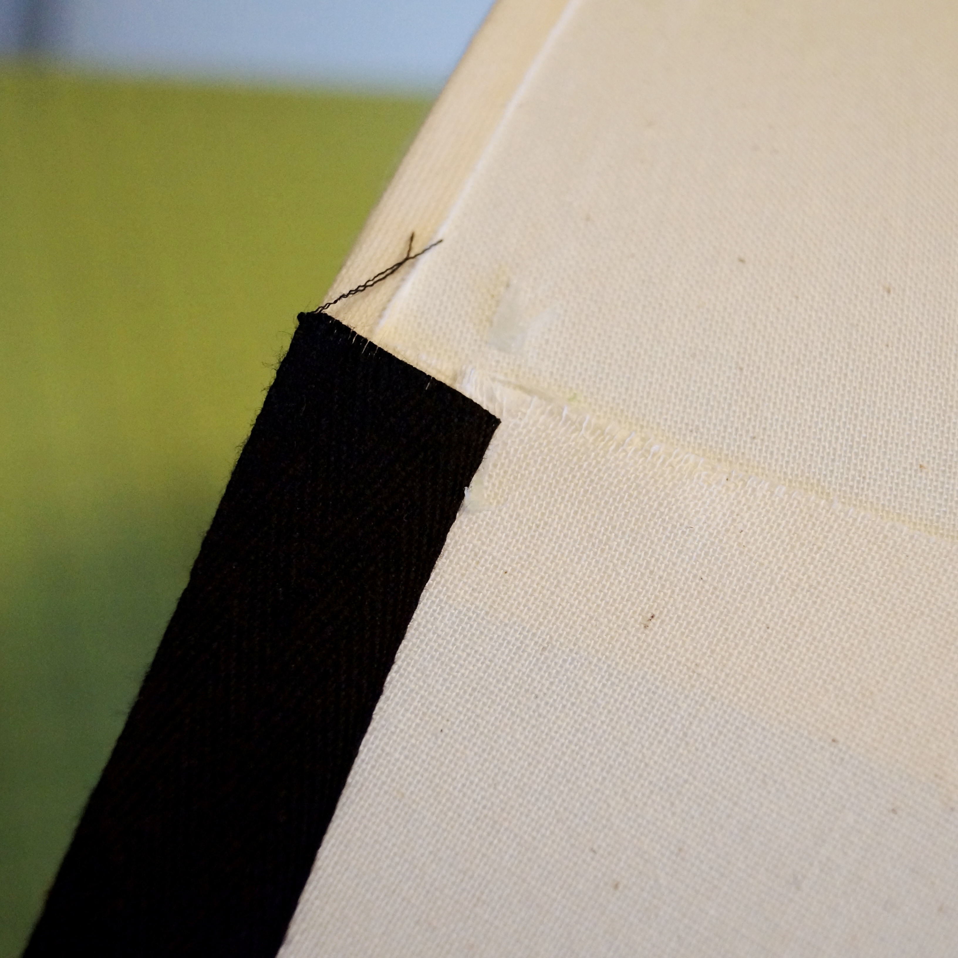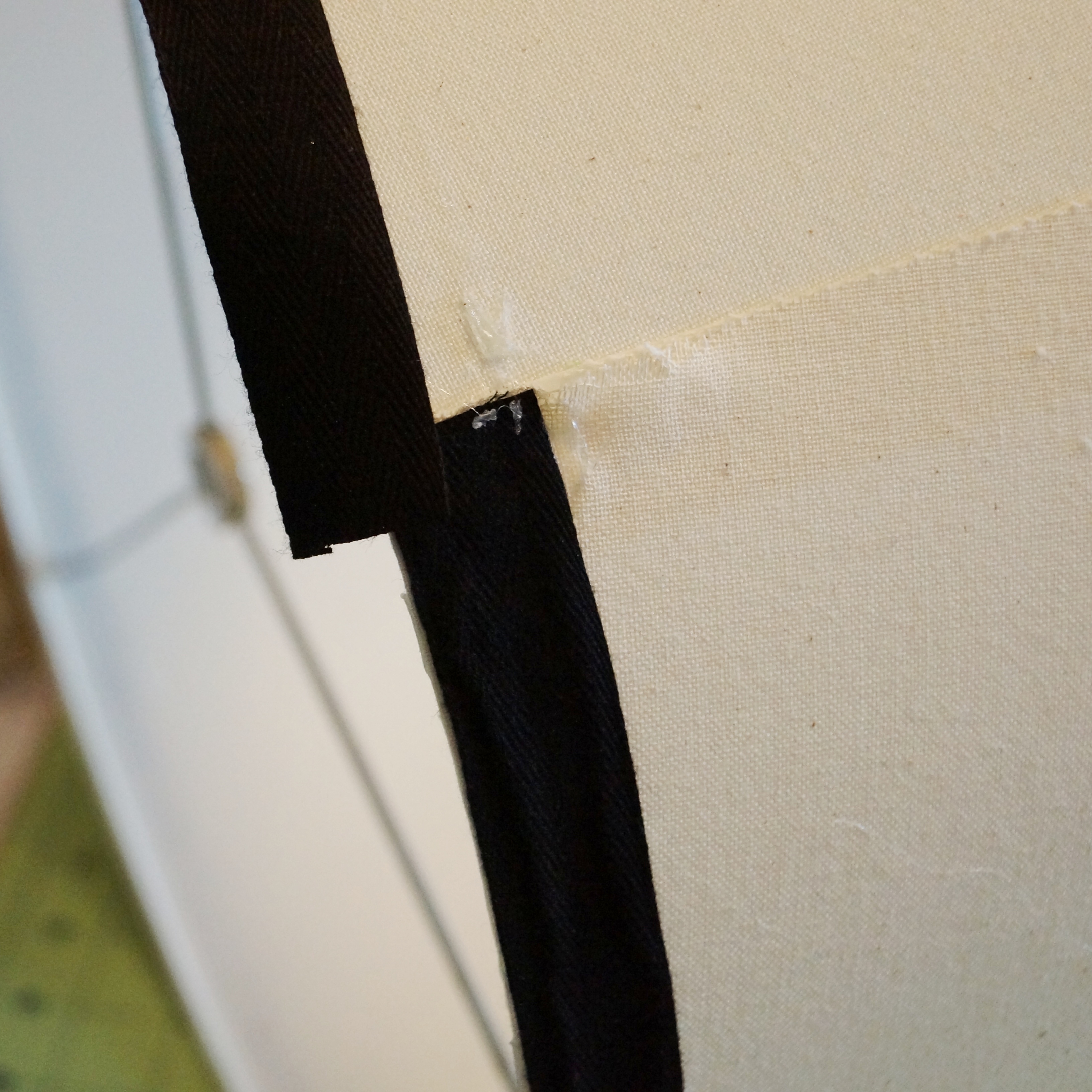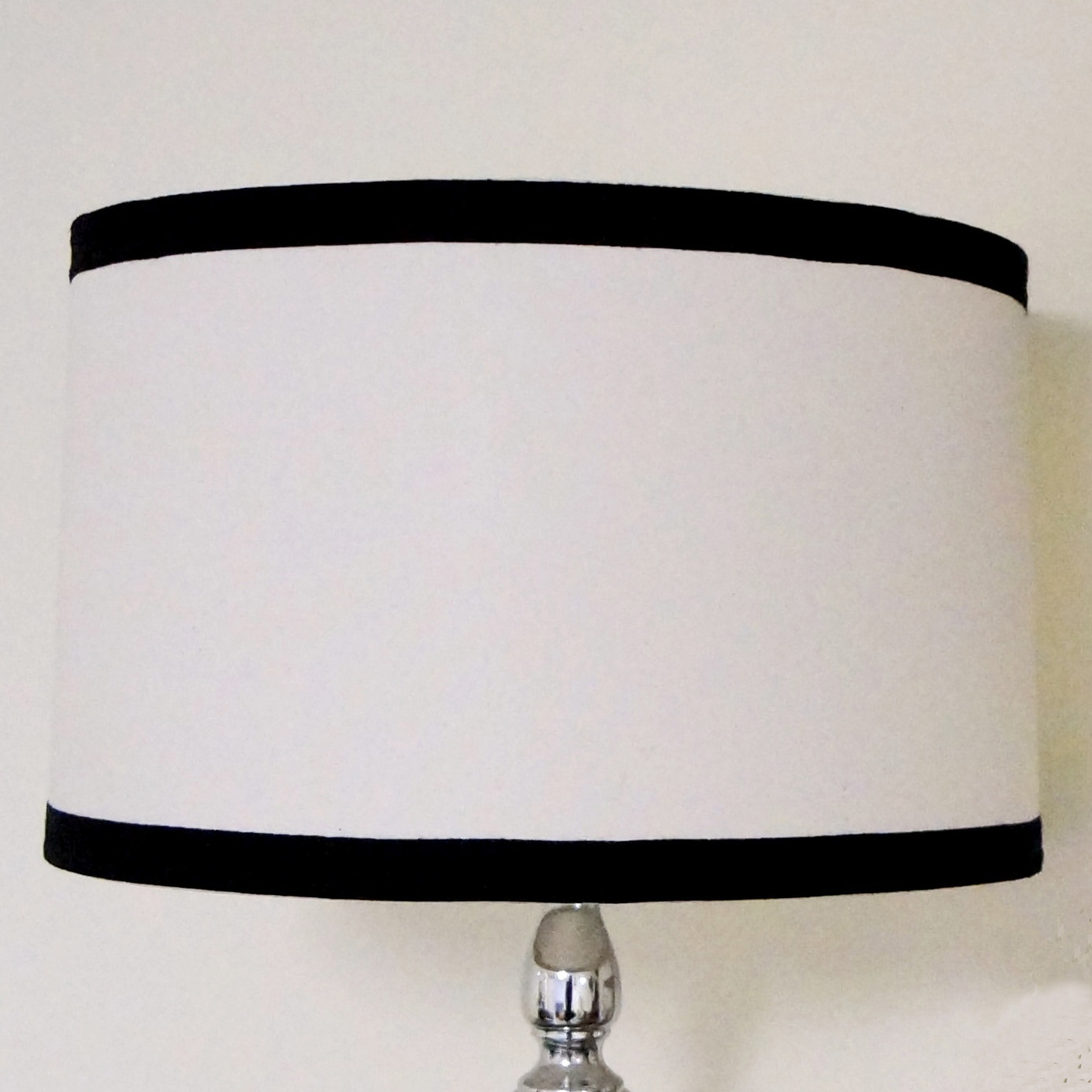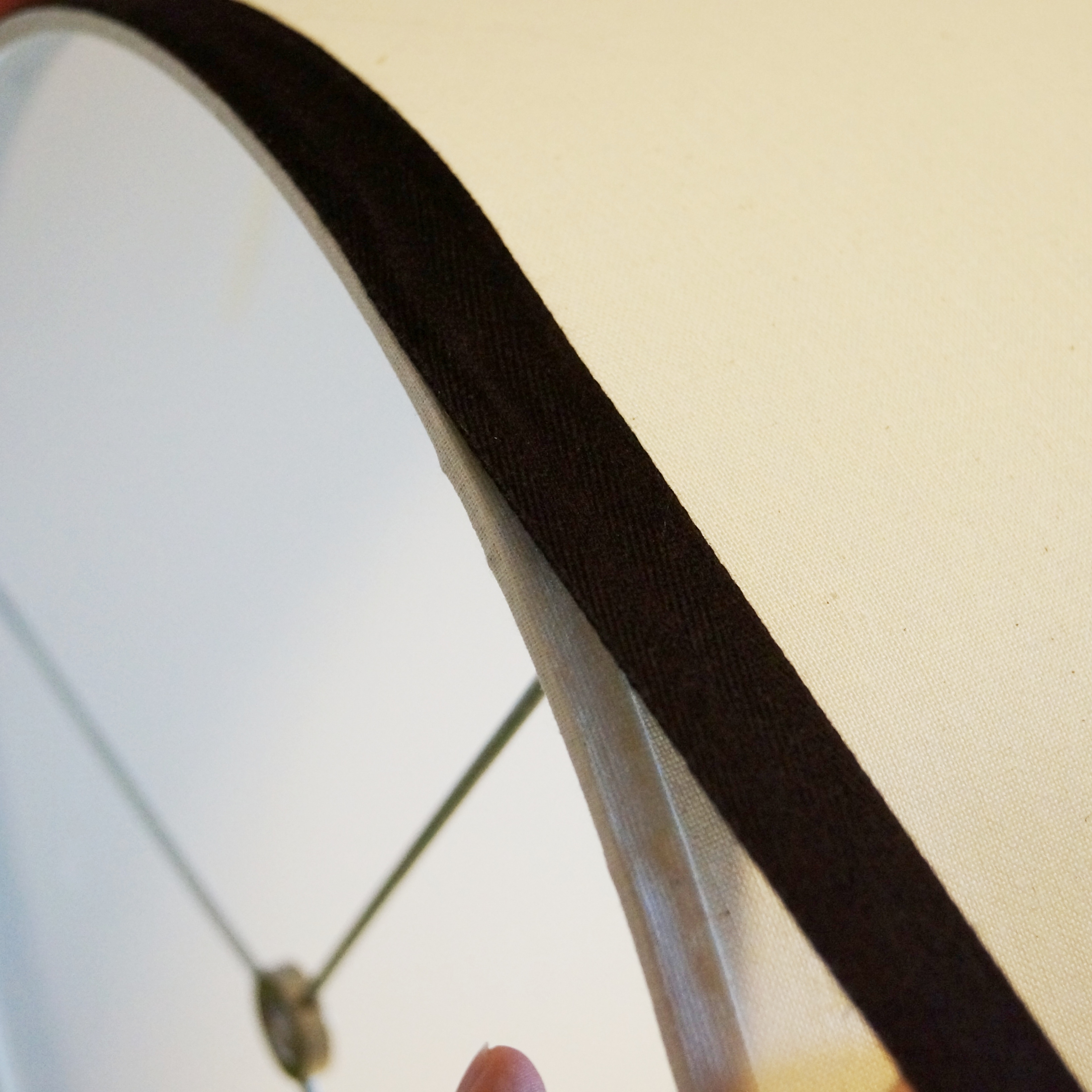 Trying not to buy new, this week I did some rearranging and moved some lamps I already had to the “Man Cave.” Unfortunately I found that the lampshades blended right into the wall color. I considered maybe adding a fabric covered shade but since I already have a lot of pattern going on in the room I thought I should go a little more subtle. That’s when I found these simple ribbon trim shades at Pottery Barn Teen for $49 each, ouch! I am pretty sure I didn’t pay that much for the whole lamp. I love the simple ribbon trim lampshade and the black would work perfectly with I the new space but I can’t justify the price. I got to thinking, since I already had the set of drum shades I figured I could try to reproduce them on the cheap.