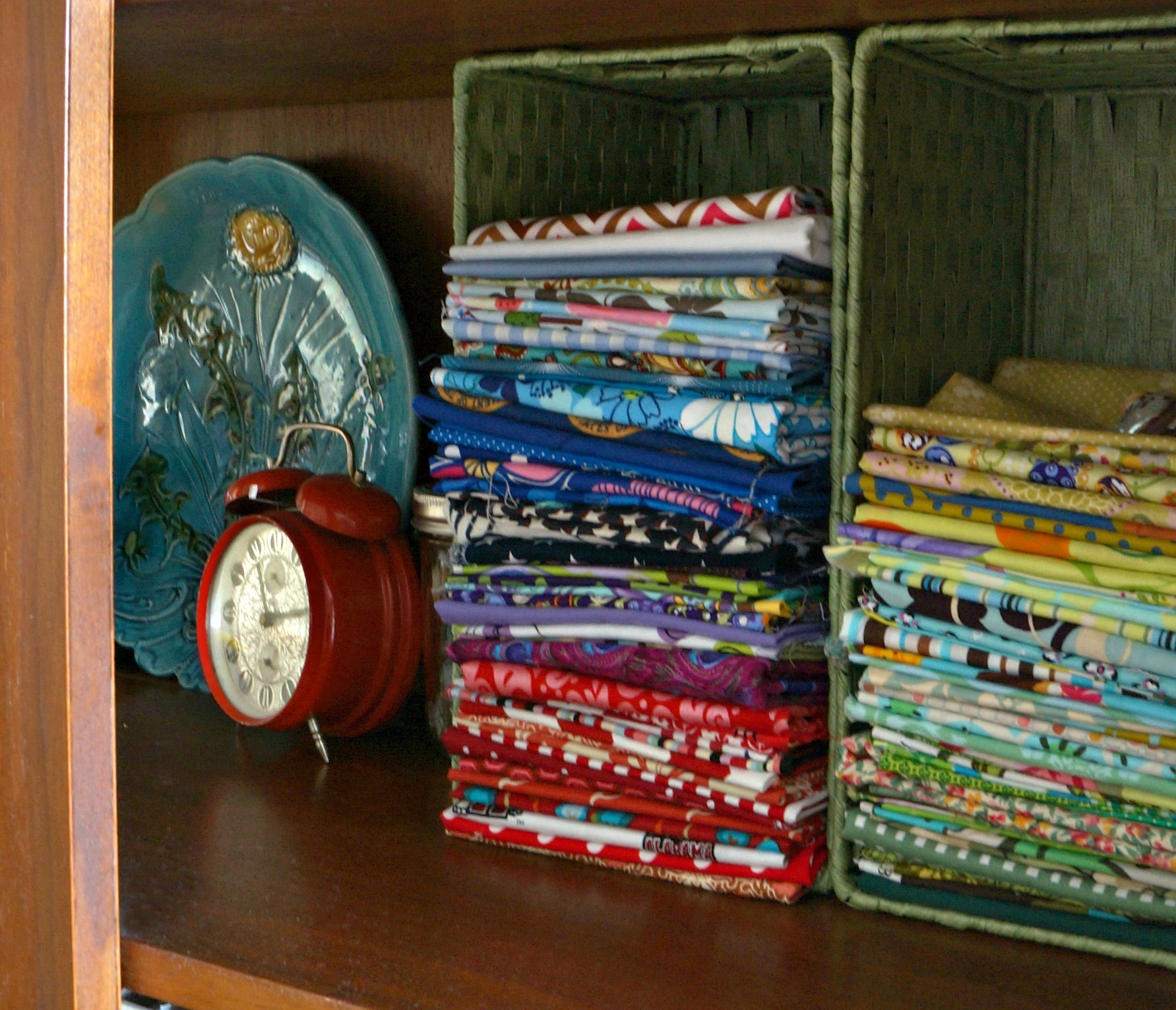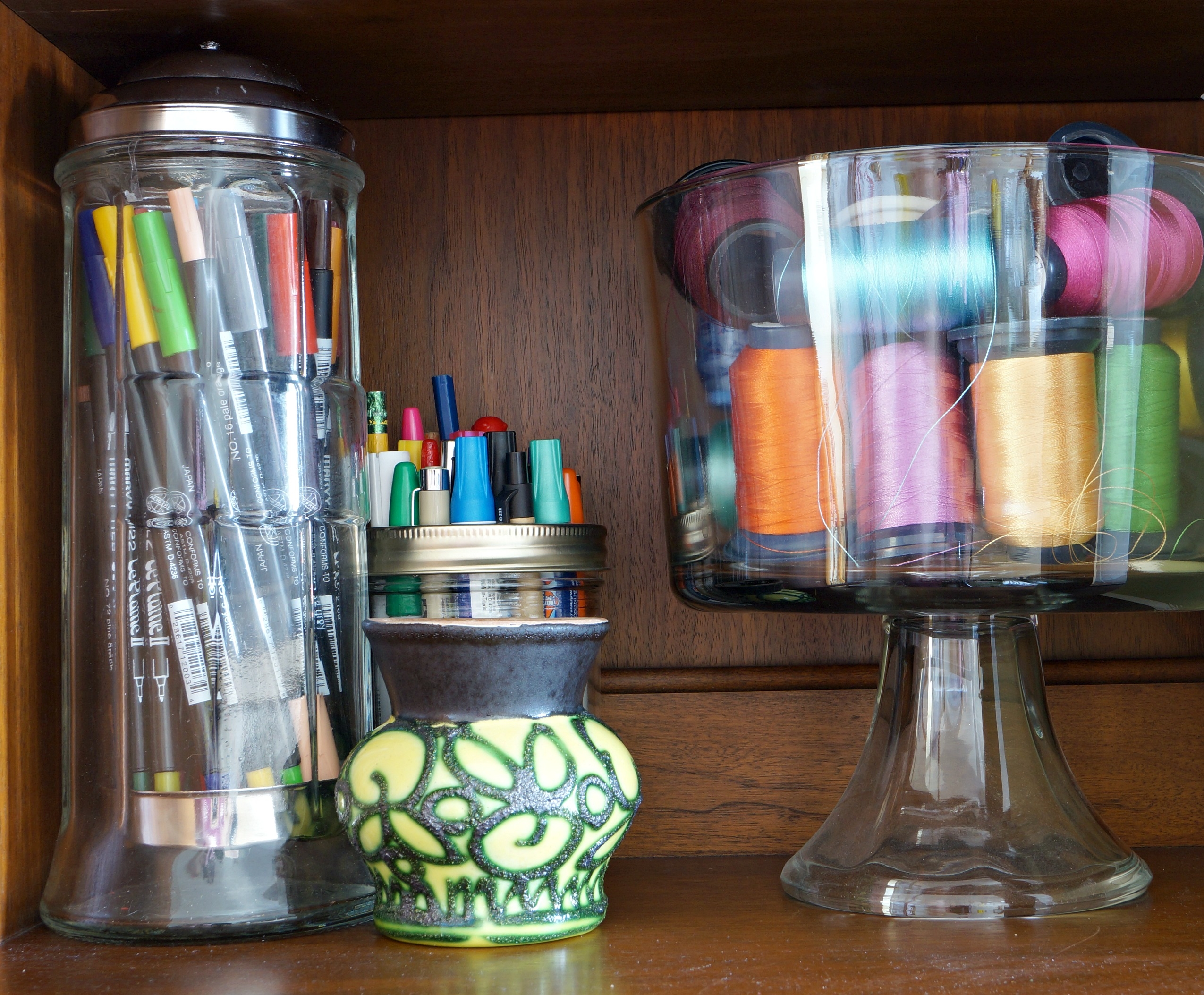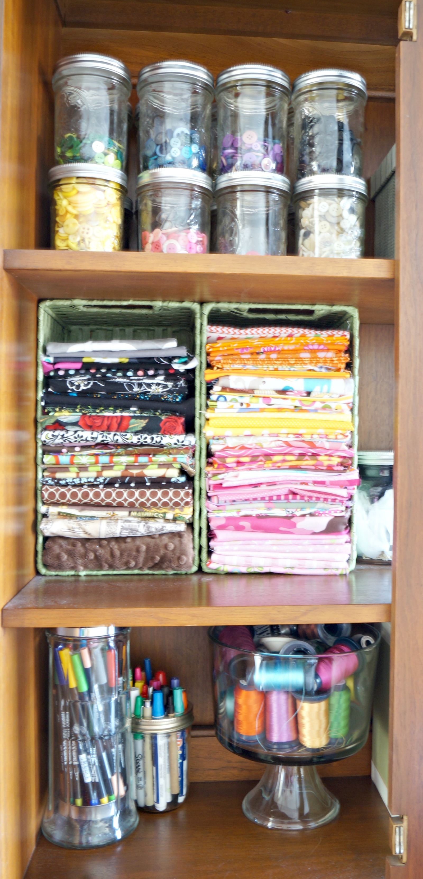 When looking for storage containers don’t limit yourself to the organization isles. I keep my tall markers in a vintage straw dispenser, thread lives in a raised trifle bowl, and fat quarter fit nicely into CD baskets.
