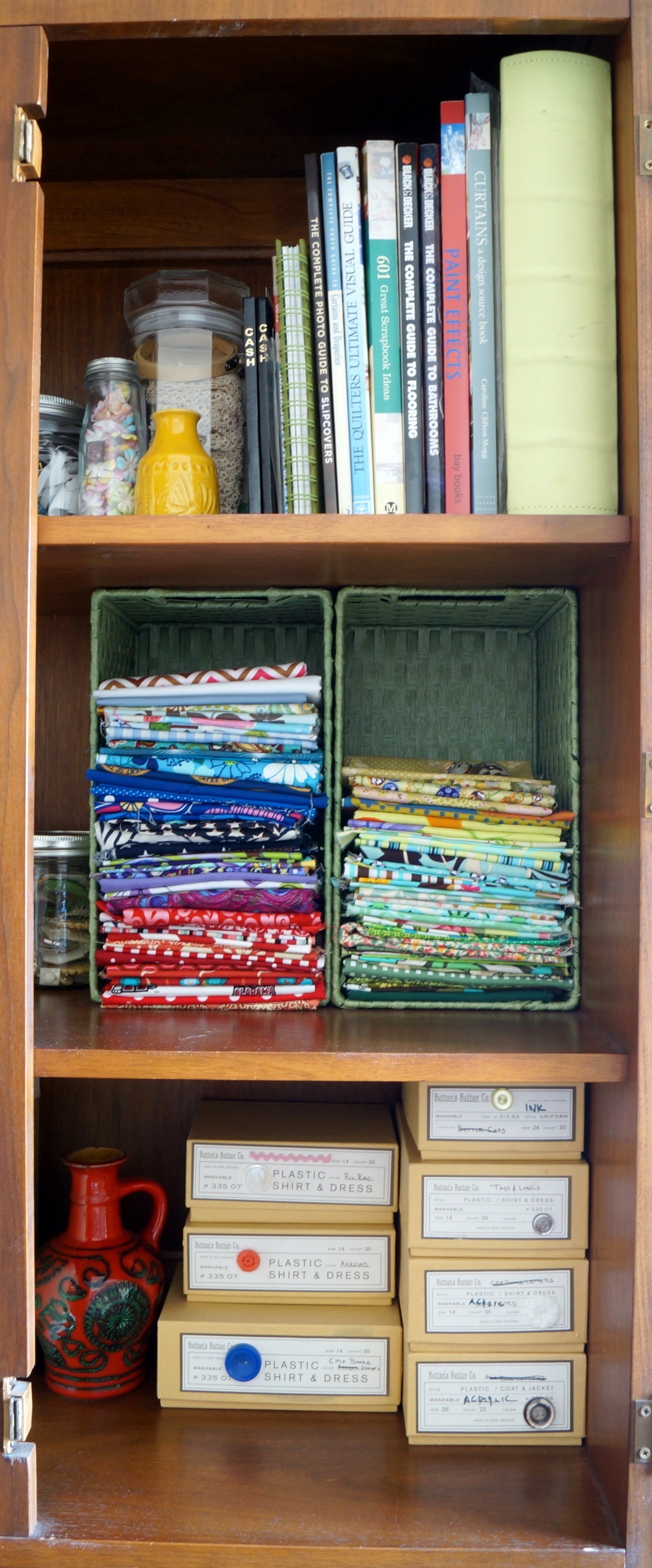 Books, buttons, embroidery thread, small cuts of fabric, they all find a home here.