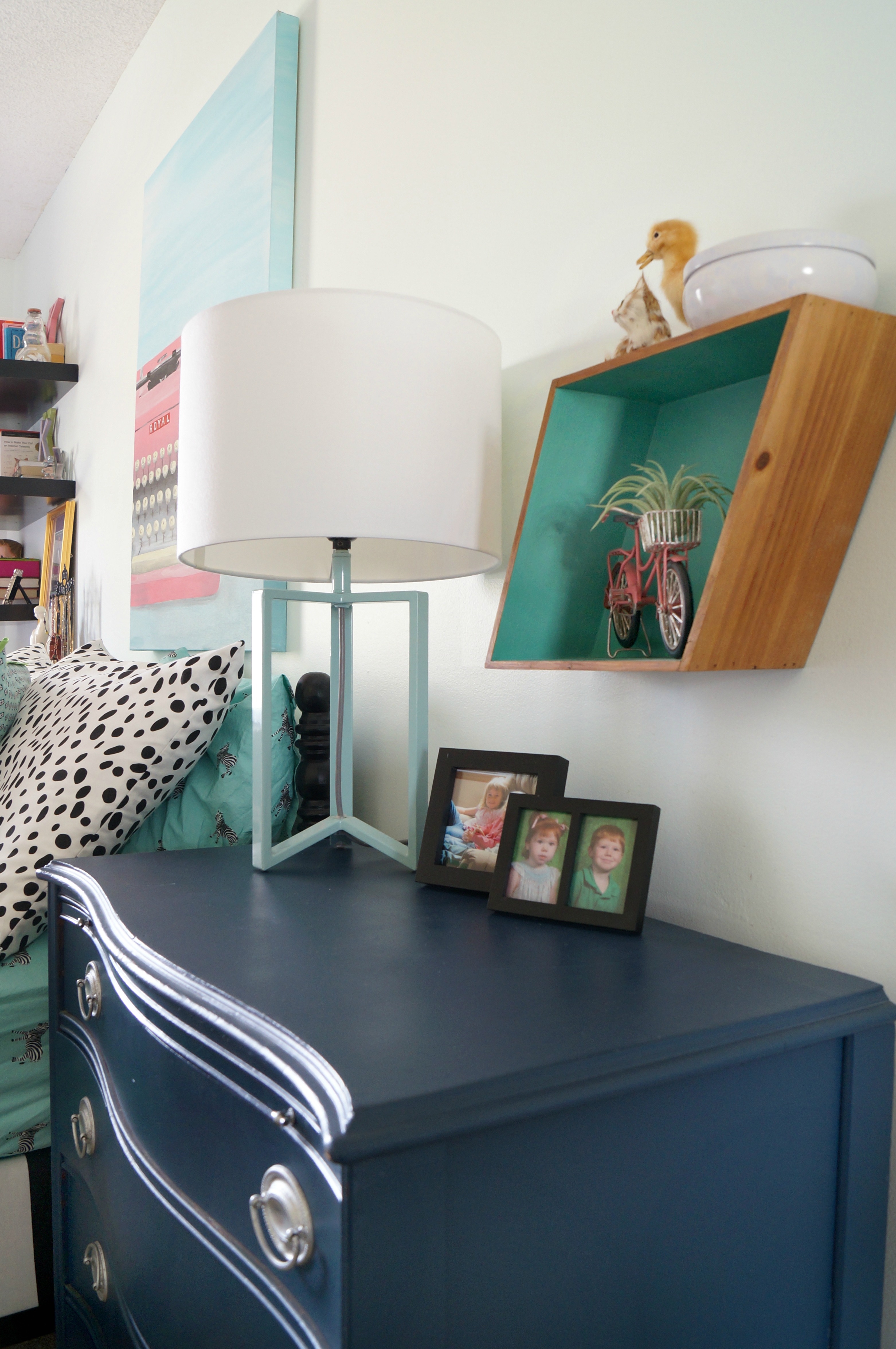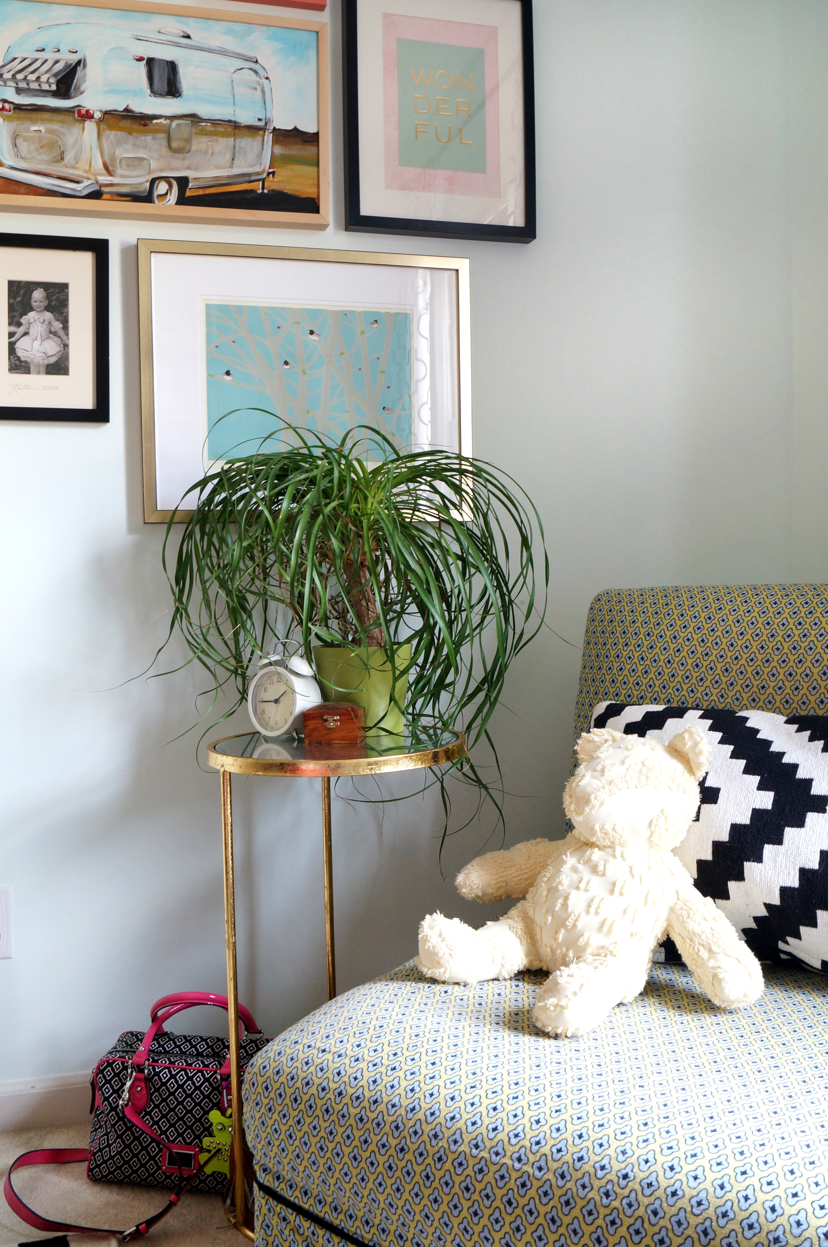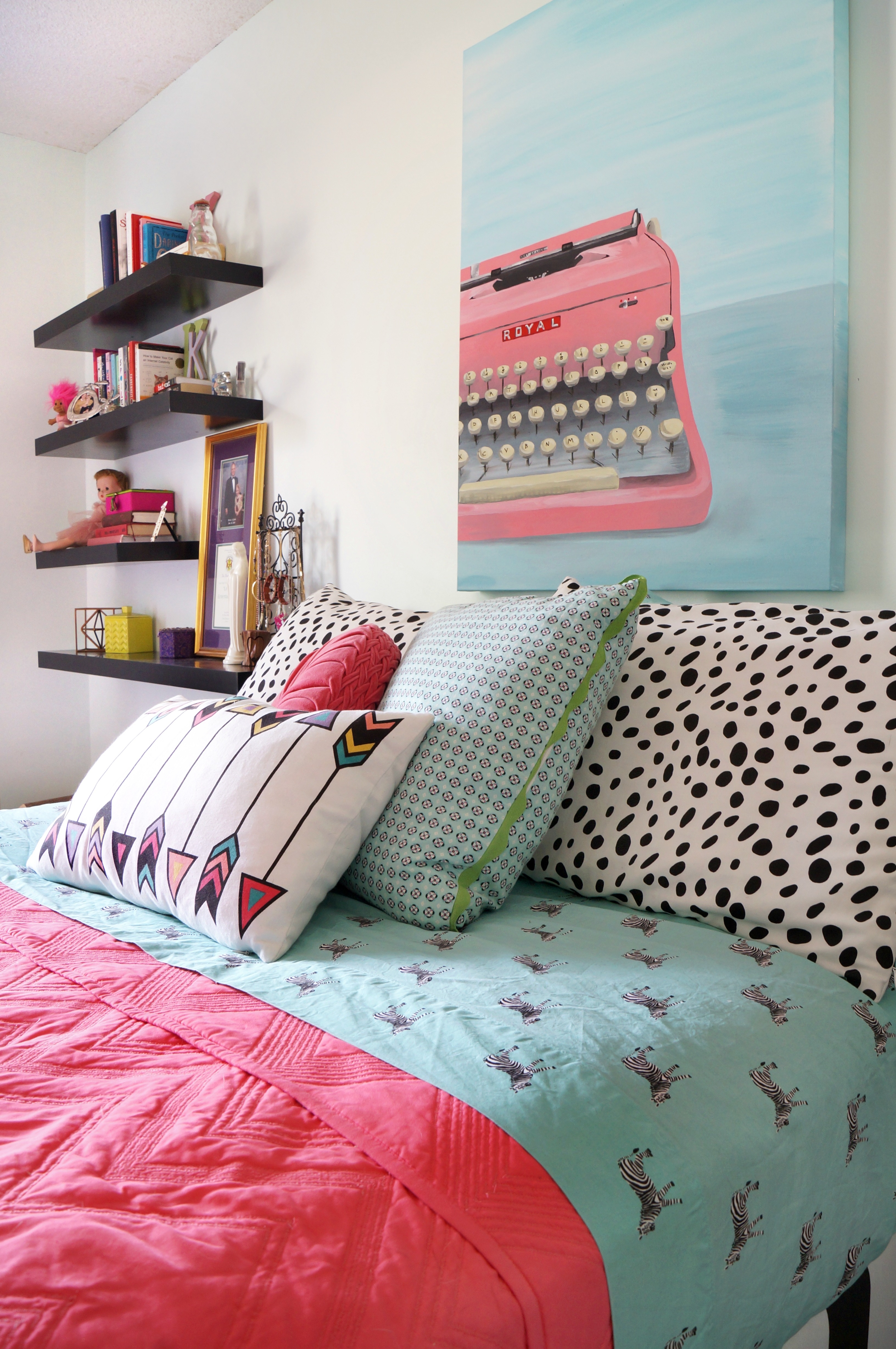 Maggie, you are incredible! I know I’ve already gushed over that typewriter painting, but seriously – AMAZING! I love the mix of colors and fabrics in this room, and my favorite little detail is the miniature pink bike with the air plant in its basket – where is it from? I need it in my life!