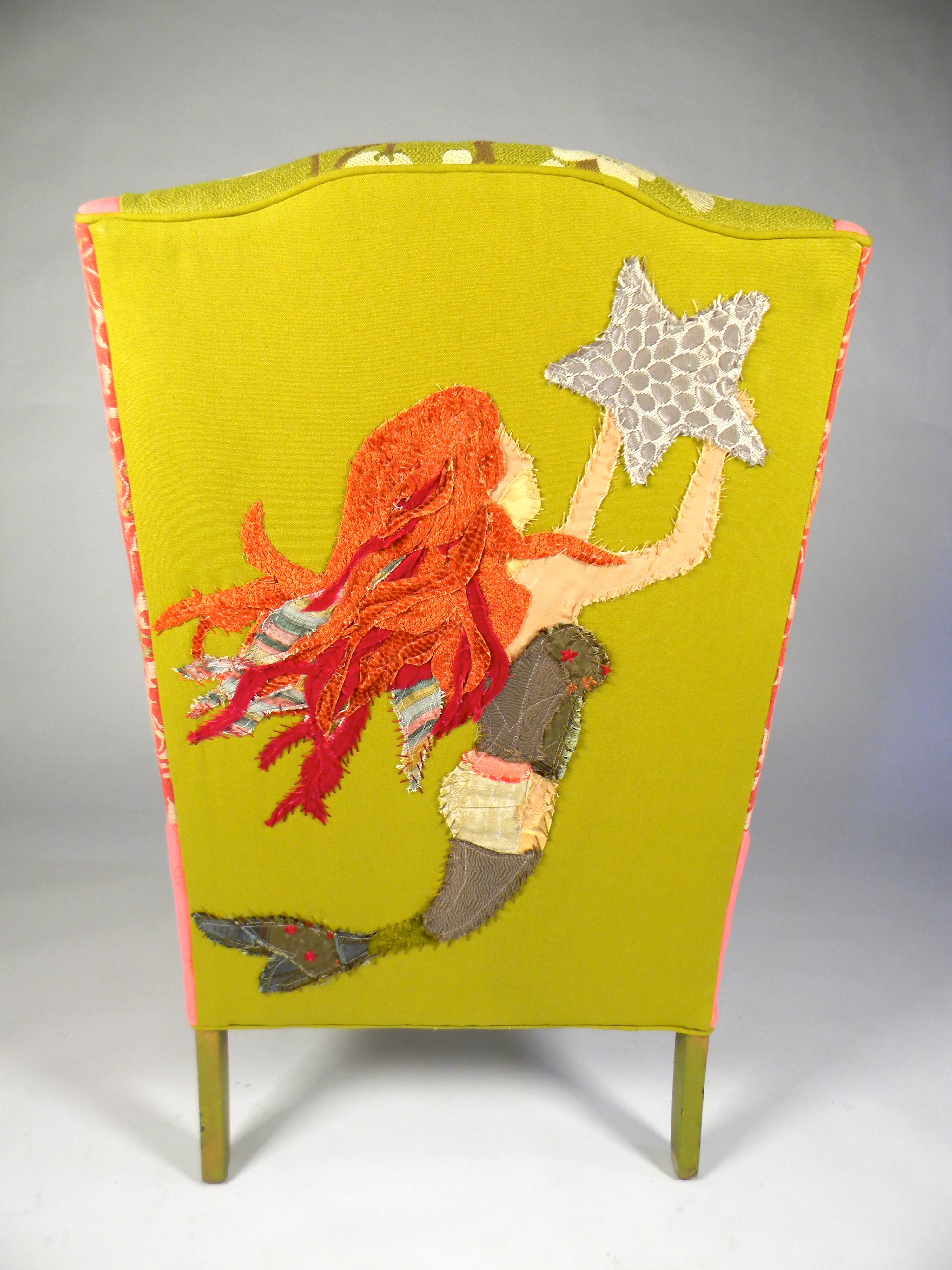 Shawna’s chairs are one-of-a-kind pieces of furniture created from vintage furniture to which she then up-cycles with a fun mix of bright fabrics, trims and often 3 dimensional fabric art. These pieces are best described by Shawna herself, “My heart, soul and hands personally go into each piece of furniture designed to be a Happy Chair. I brazenly mix and reconstruct new and vintage fabrics. Exciting patterns and inspired details bring unique character to life in each original piece. Once completed each Happy Chair is given a name based on its distinct personality. Yes it takes time, creativity and patience but the end result is magic derived from passion.”
