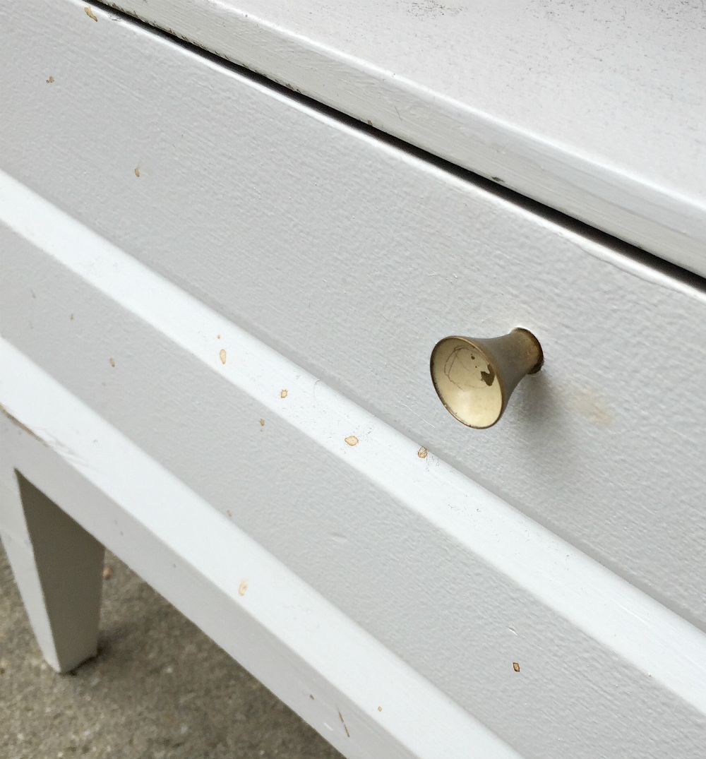 Stripping furniture is not my favorite chore but every now and then I find a great piece of furniture with an unfortunate paint job that demands my intervention. When I saw this great little nightstand at the thrift store for $10 I fell in love with the lines but was a little leary because you never know what you’ll find under the paint.
