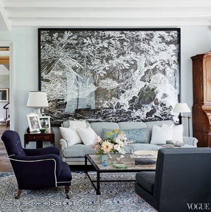 5. Feeling a little nervous about committing to mural wallpaper? How about a hanging it as a large scale art like this one in Vogue. For me the plus, I can take it with me when I go, if it will fit on the truck…