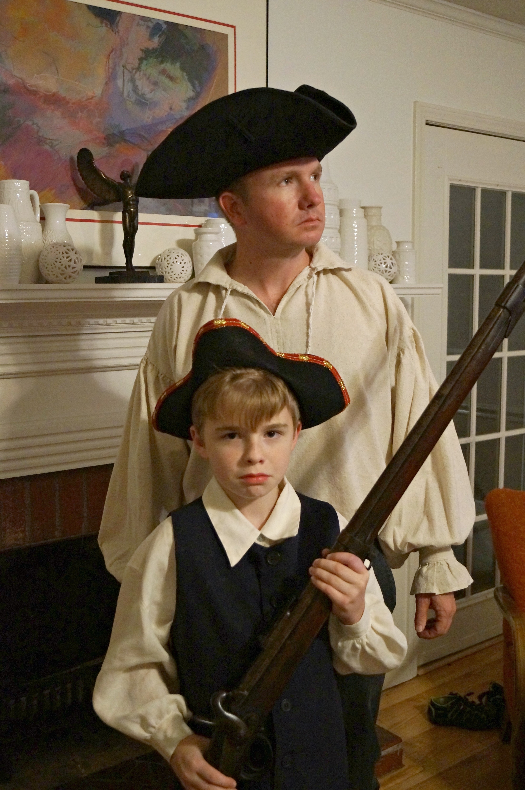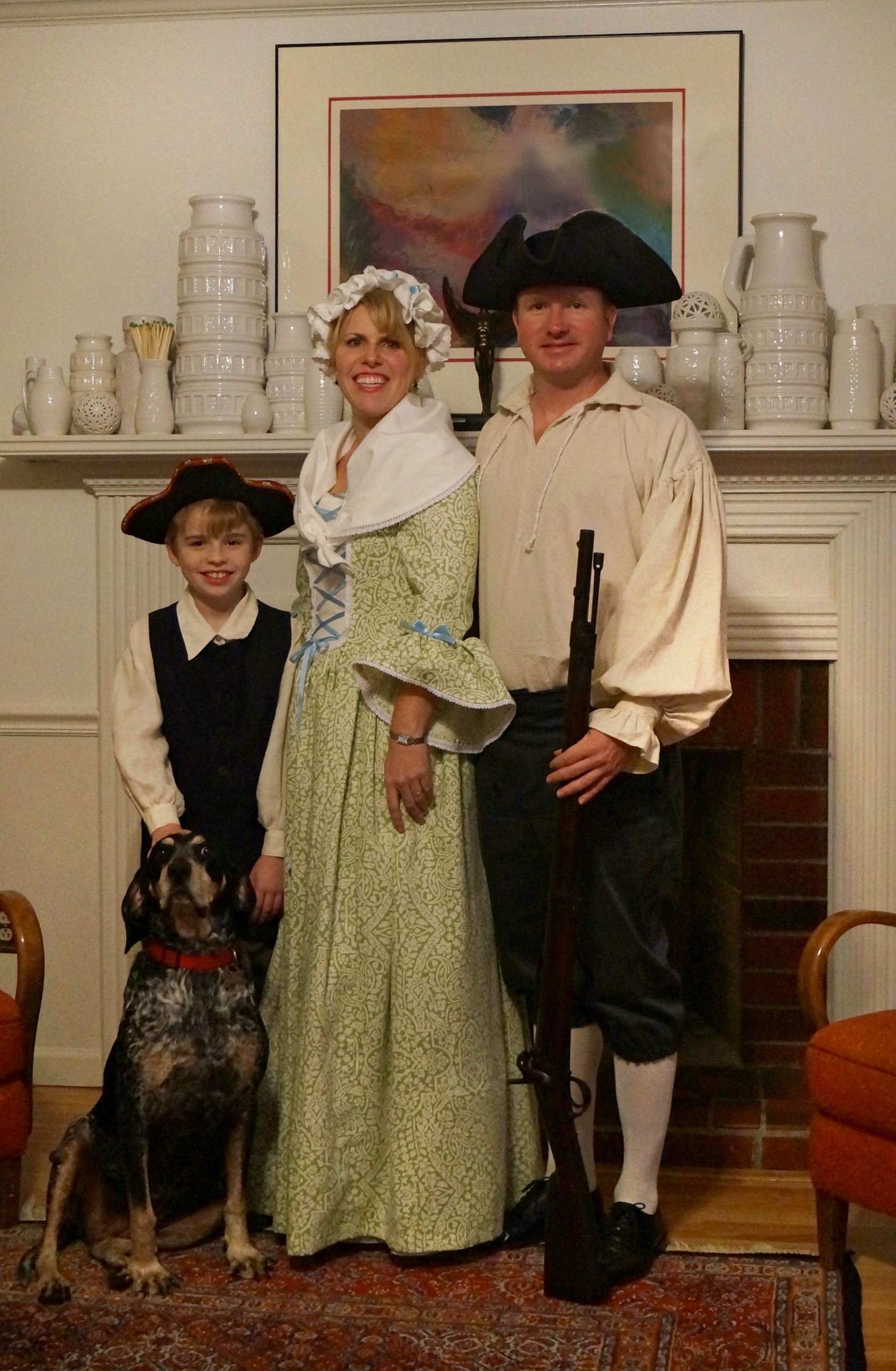 And since I figured I can stand a little embarrassment for your enjoyment, the Colonial costumes I made for this weeks activities. My husband and son felt they needed to look stern in the second photo since they always look that way in old photos. I guess they forgot that there were no cameras in Colonial America, but oh well.