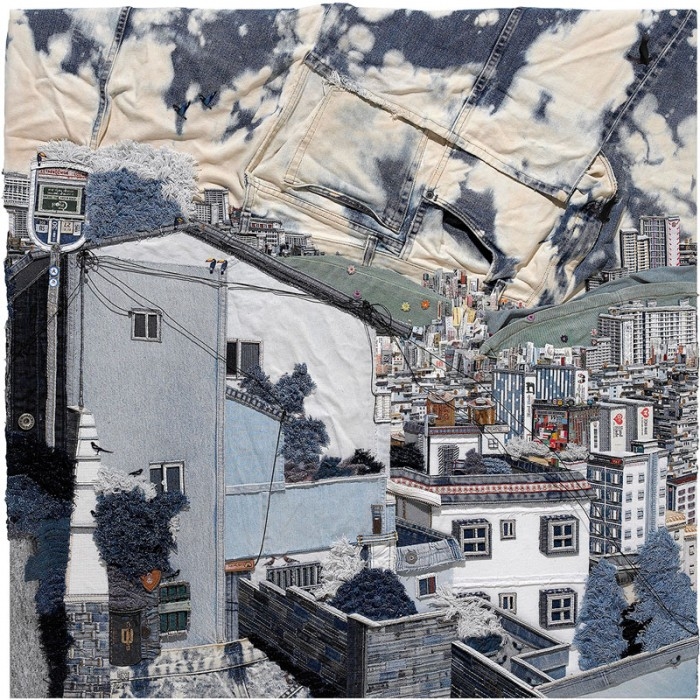 4. Korean artist Choi So Young is painting with denim. Using second-hand jeans Young re-purposes their pockets, seams, belt loops and buttons, to create windows, streets and buildings of her multi media landscapes.