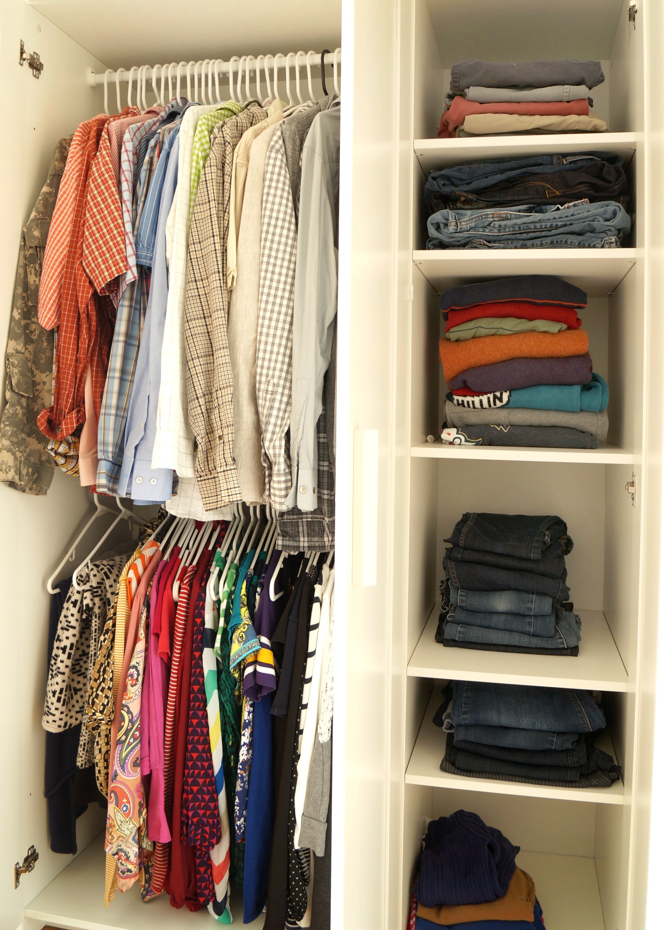 Once I cleared out the excess a little organization was all I needed. I installed extra shelves for folded clothing and shoes. For jewelry I added cup hooks on the inside of the door across the top, no more tangled necklaces. Voila!