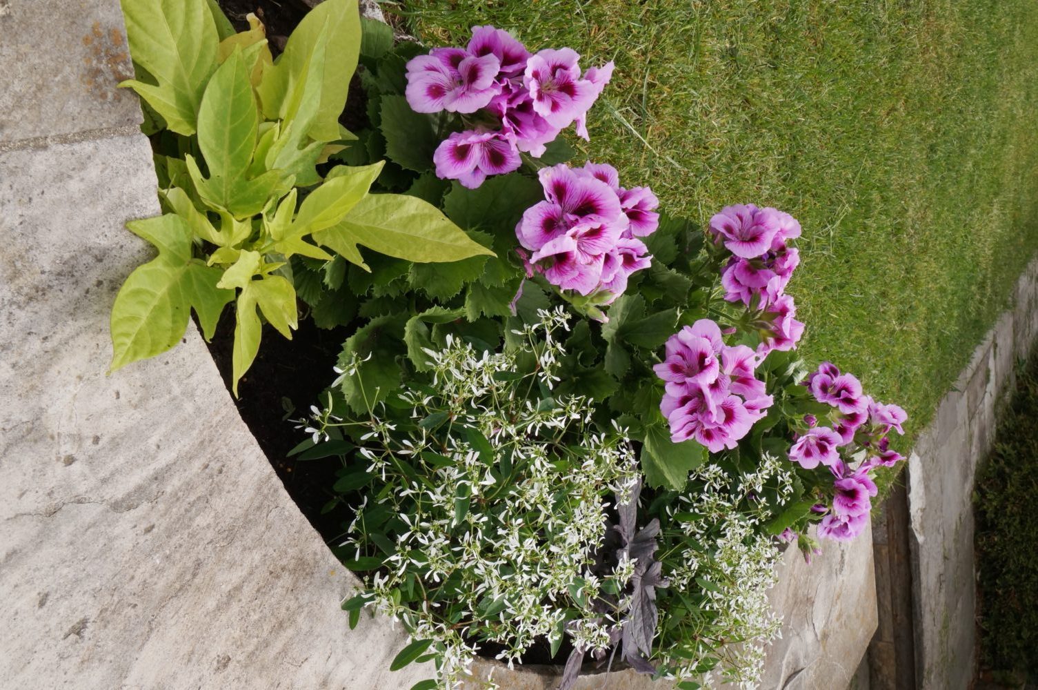 And the droopy tulips, they have been replaced with some lovely Geraniums and my very favorite (very hardy) Sweet Potato Vines.