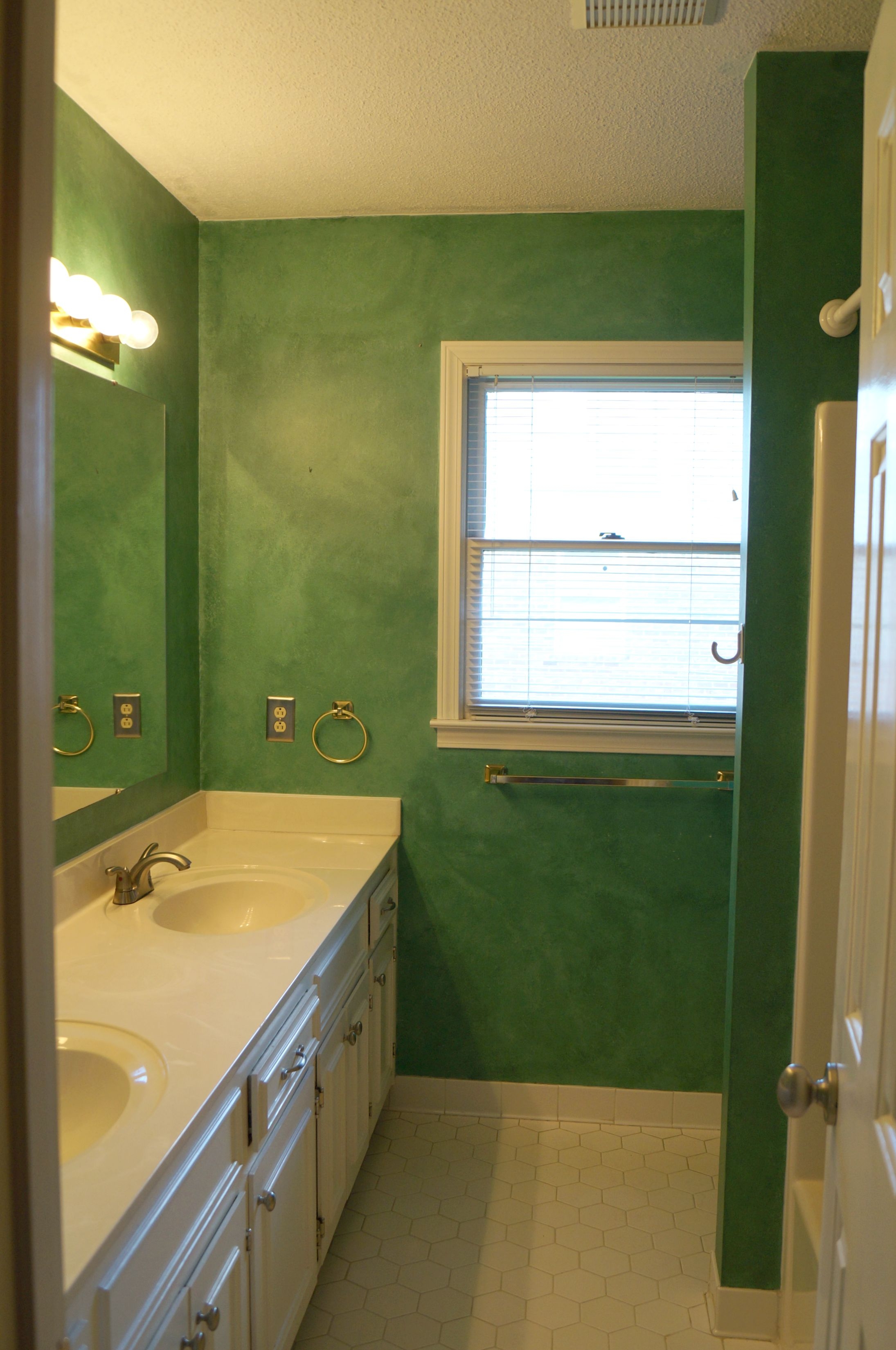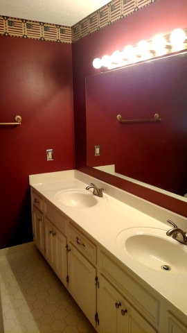 The master and hall bathrooms are almost I identical with double vanities and paint colors that ABSOLUTELY must go. I’m thinking those movie star vanity lights may be heading to the attic during my stay as well.
