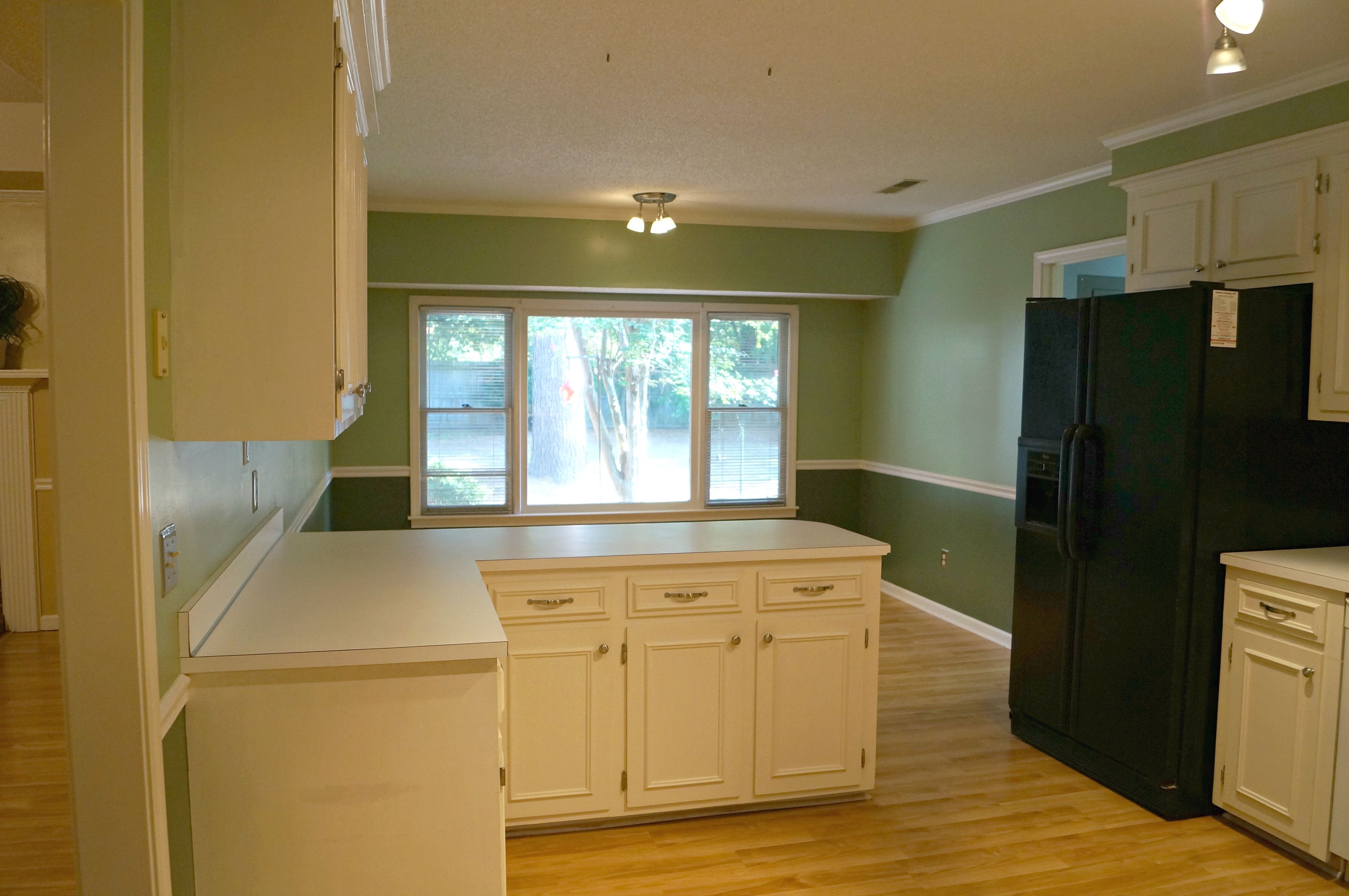 The kitchen with a peninsula bar and an eat in dining area. The green in this area is not horrible but I might have to do a some painting just to brighten this area up.