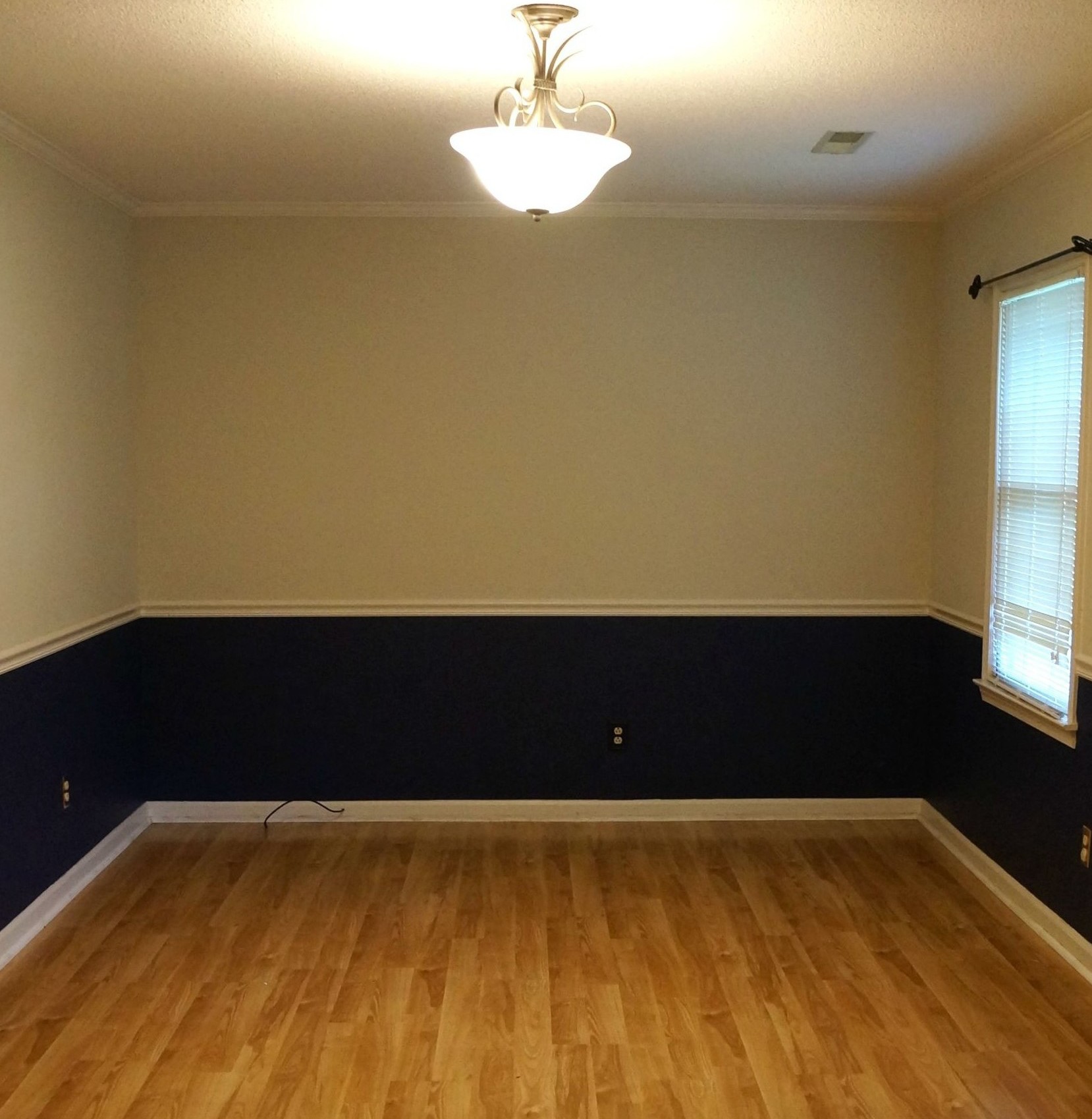 Finally the room that should be the formal living/dining room (but is a good size for neither) had a coat of dark navy that needed to go. This space will be my husband’s man cave and fortunately was already painted a nice warm grey above the chair rail. I decide to continue the Quail Egg below the chair rail in all the living spaces and keep the upper as is. I think this is one of the few rooms in the house that will not need a full paint job.