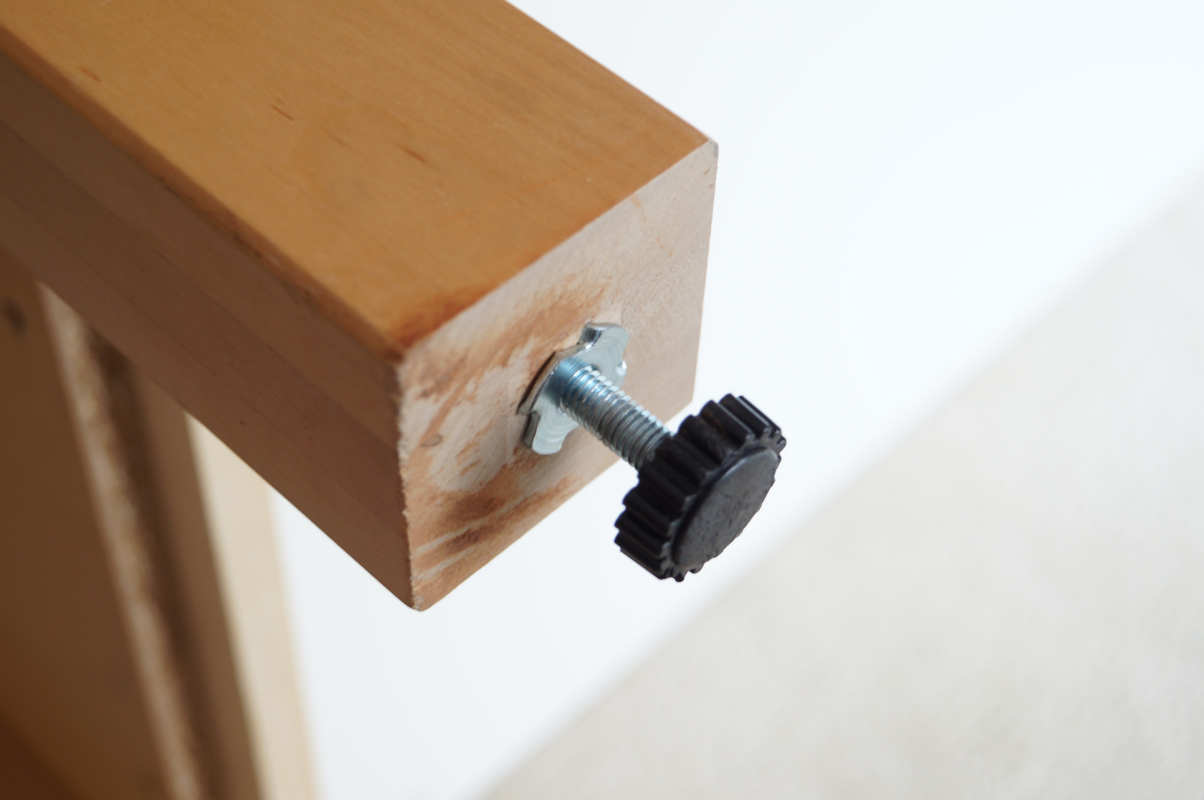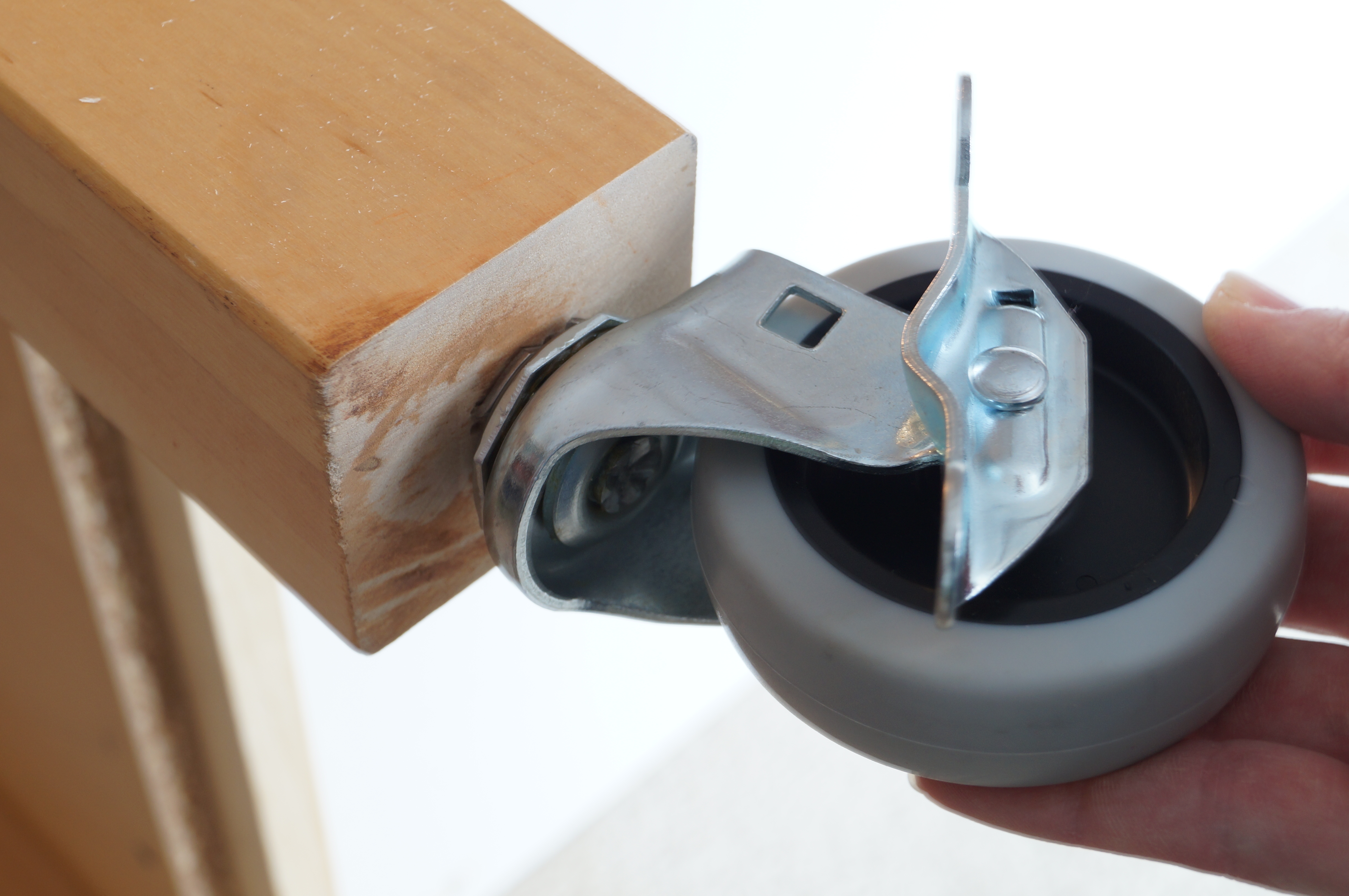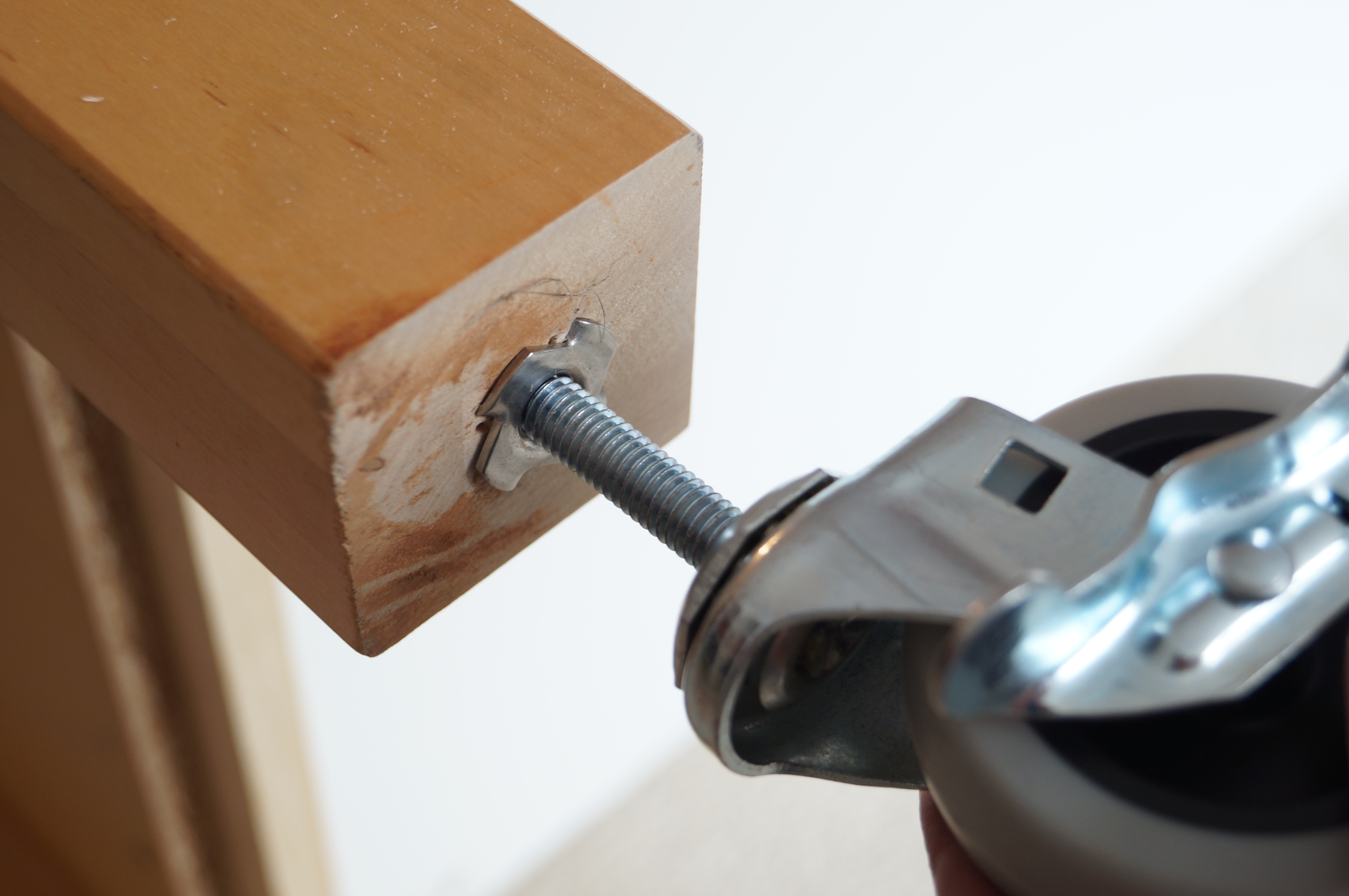 The cutting table which is actually an Ikea VÄRDE island already had leveling feet so it was just a matter of removing the old feet and screwing in the locking casters I bought at Lowes for about $7.50 each. (If the bolt on the wheels does not match the size of the existing t-nut these can be removed and replace with a larger size by drilling out the hole and replacing the nut.)