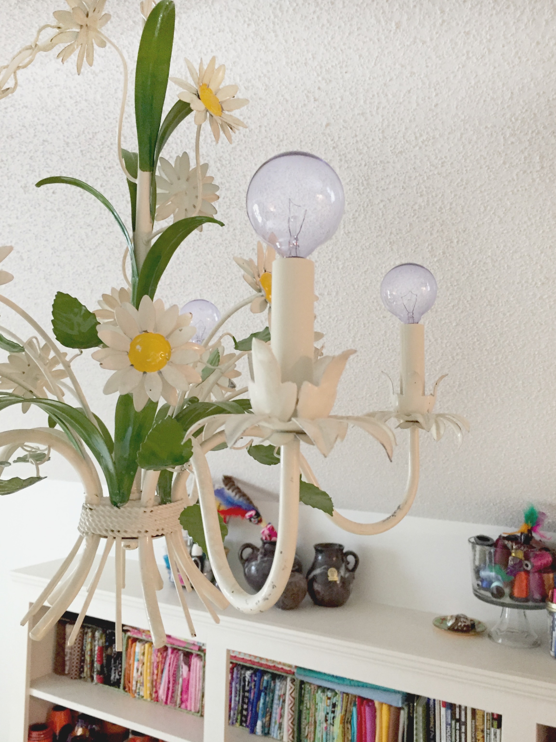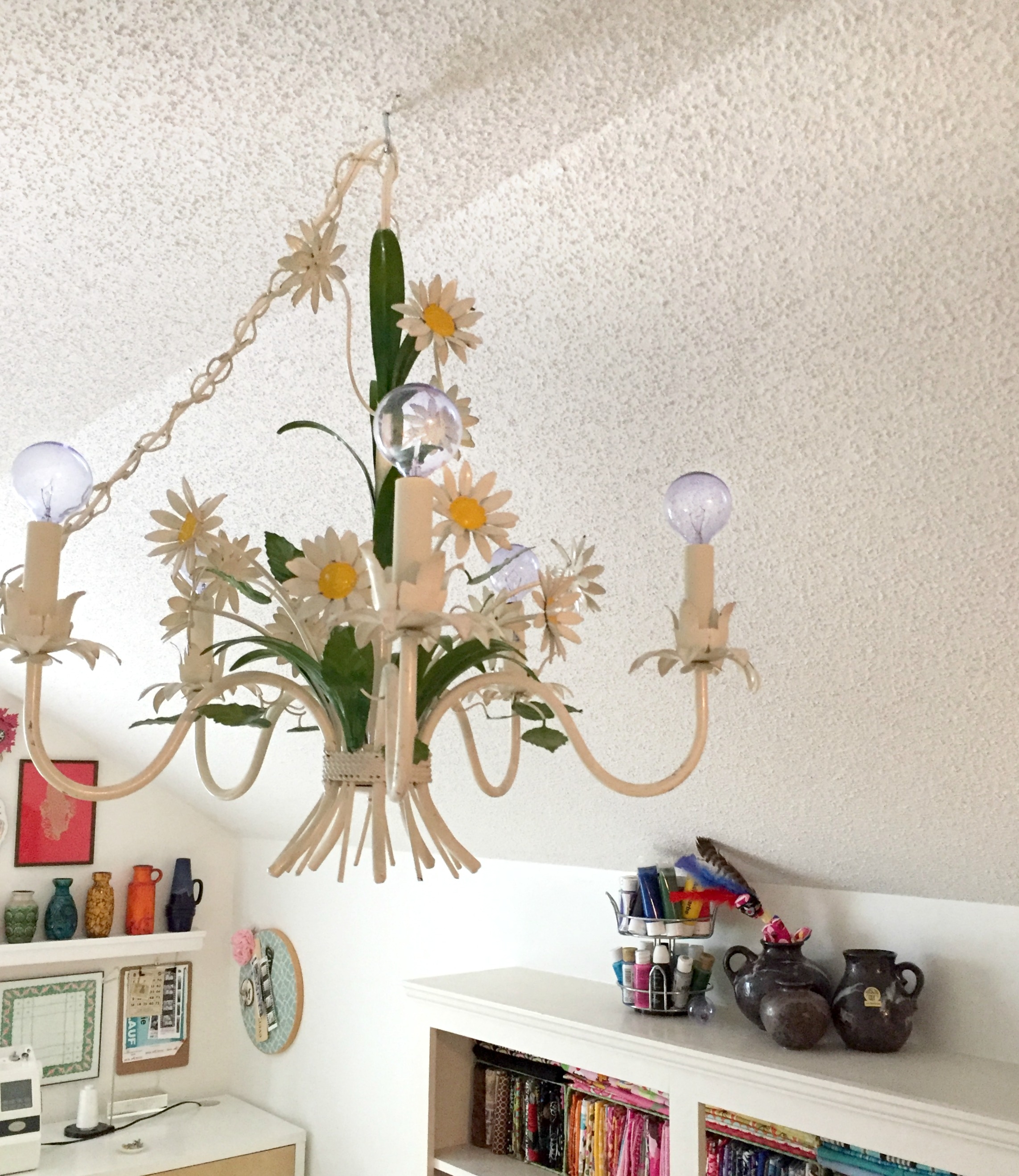 I found this super cute daisy chandelier at a local antique shop for $89 and with a little work I got it working perfectly in this space. I even decided that since my cutting table could travel so could my lighting. I added a two different hooks so I can move the light as needed so no one hits their head when the table moves. Since the ceiling are low this is easily done without even needing a step-ladder.