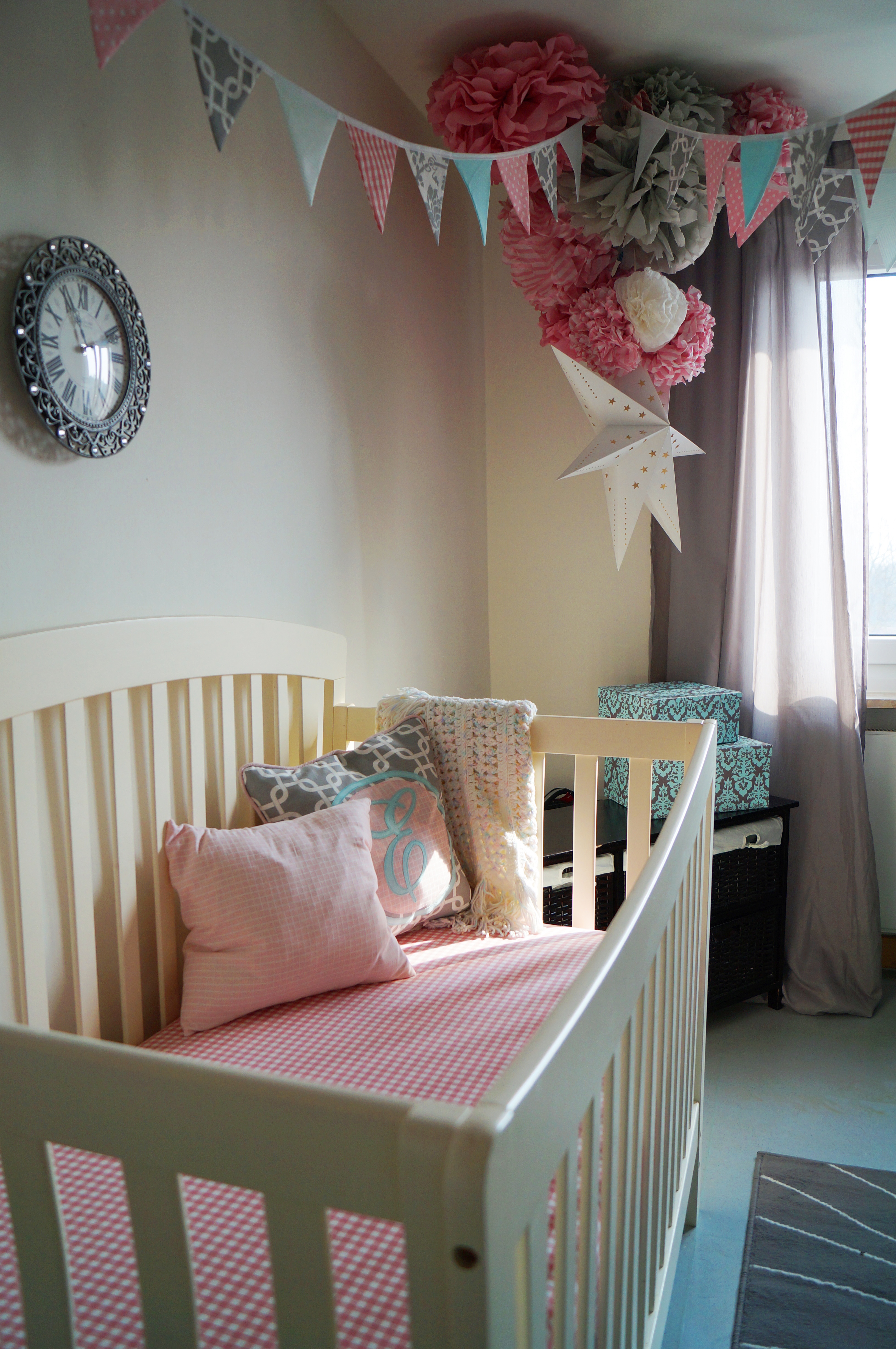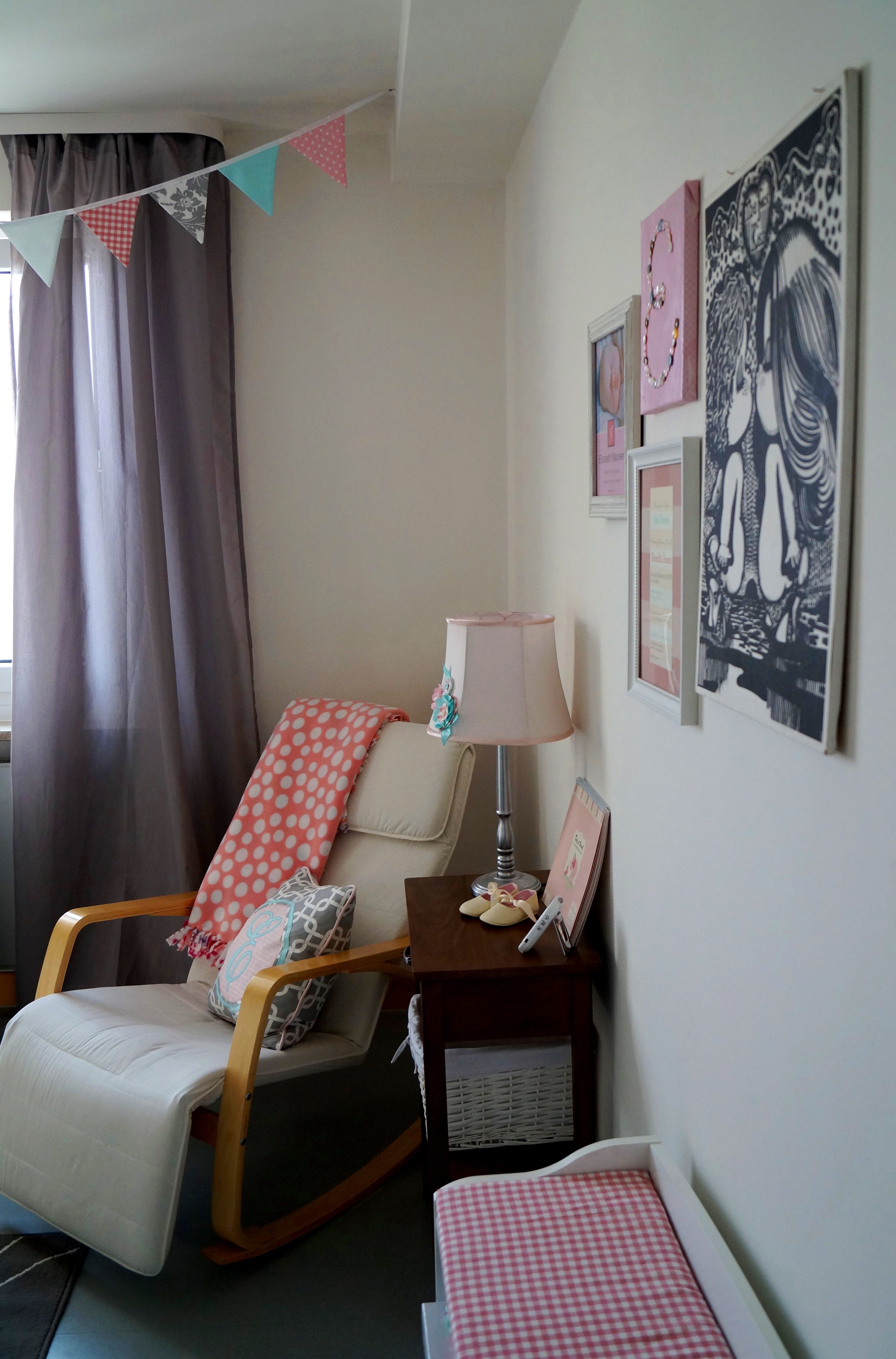 I tied it and together with the Ikea GISLEV low pile rug in grey for only $20. I accessorized with gifts from the clients friend and all the shower decorations which are now re-purposed as nursery decor. Add a hand me down crib and curtains and a storage bench borrowed from another room and you get a nursery perfect for a new baby girl!