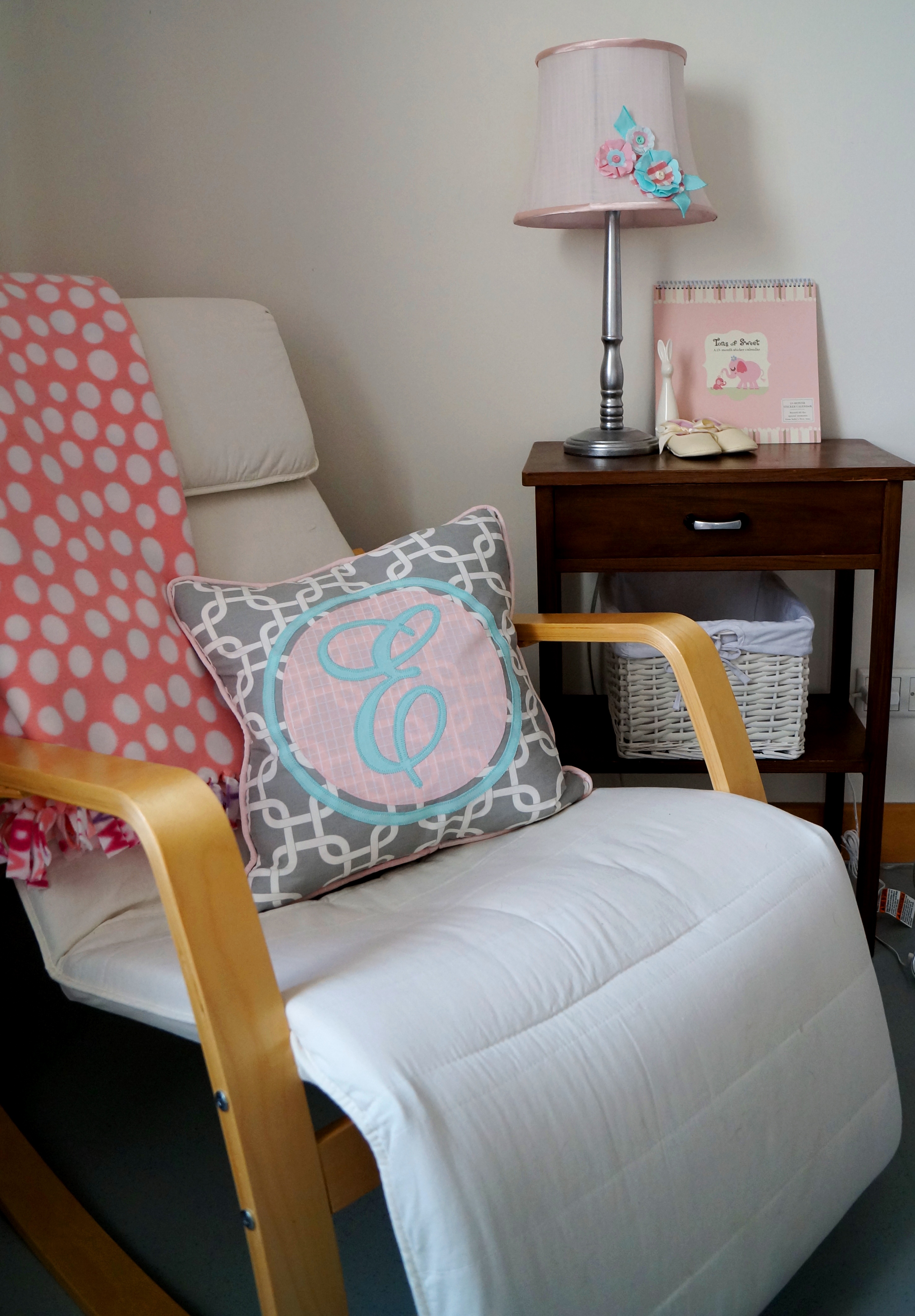 I chose the Ikea POÄNG Chair with a natural cover for $69 at Ikea but I actually found my chair at another furniture store that was going out of business for only $45. It is very similar in style to the Ikea POÄNG but this one is actually a rocker and has an adjustable foot rest. More chair for less money, it was a great find. The side table is a $5 thrift store find and lamp was as well. The lamp base was $5 and with a coat of silver paint looks brand new. The shade was $2 to which I added some 3D flowers I made myself for a little girlie flair.