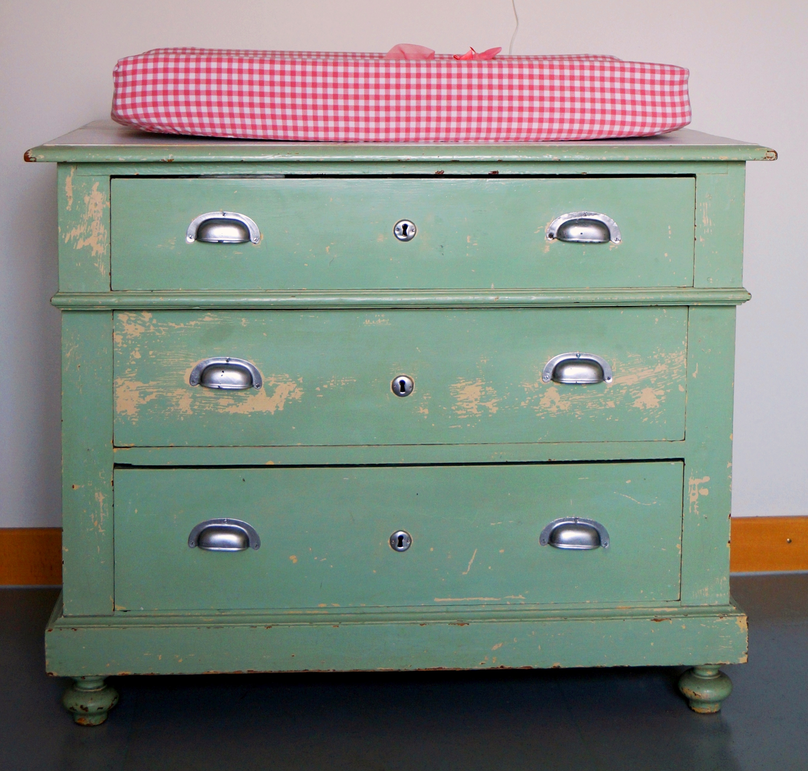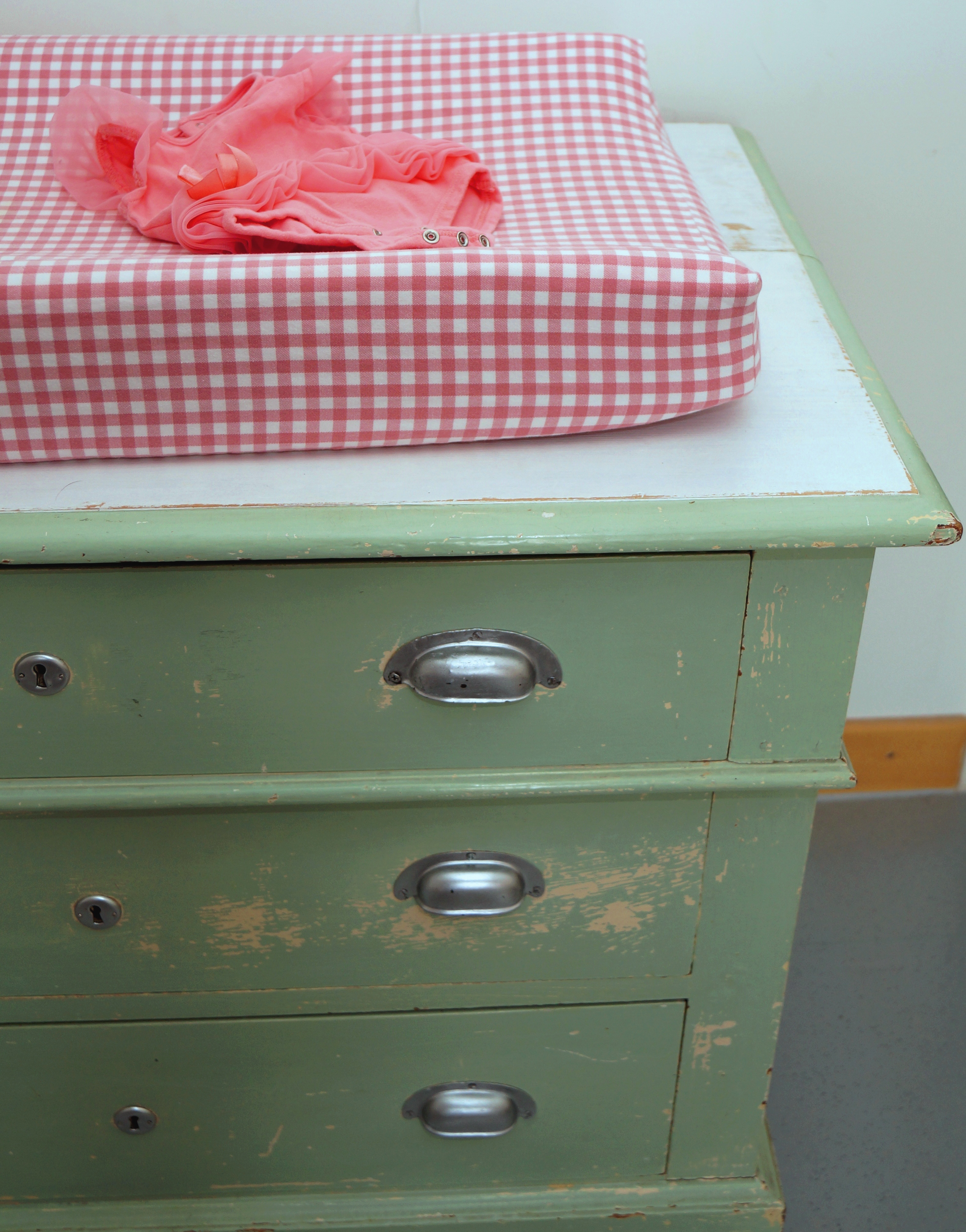 The antiques dress was also a thrift store find for $70. It has a great patina and when paired with the pretty pink Berta gingham fabric from Ikea it really pops. I also used this fabric on the crib sheet and in the bunting flags, which at $9 a yard was a good deal for good quality fabric. The crib skirt is Premier Prints Gotcha Twill in Storm and again this is a great quality fabric for only $7.50 a yard and the scraps went into the bunting as well. Just $70 worth of fabric got this nursery fit for a princess.