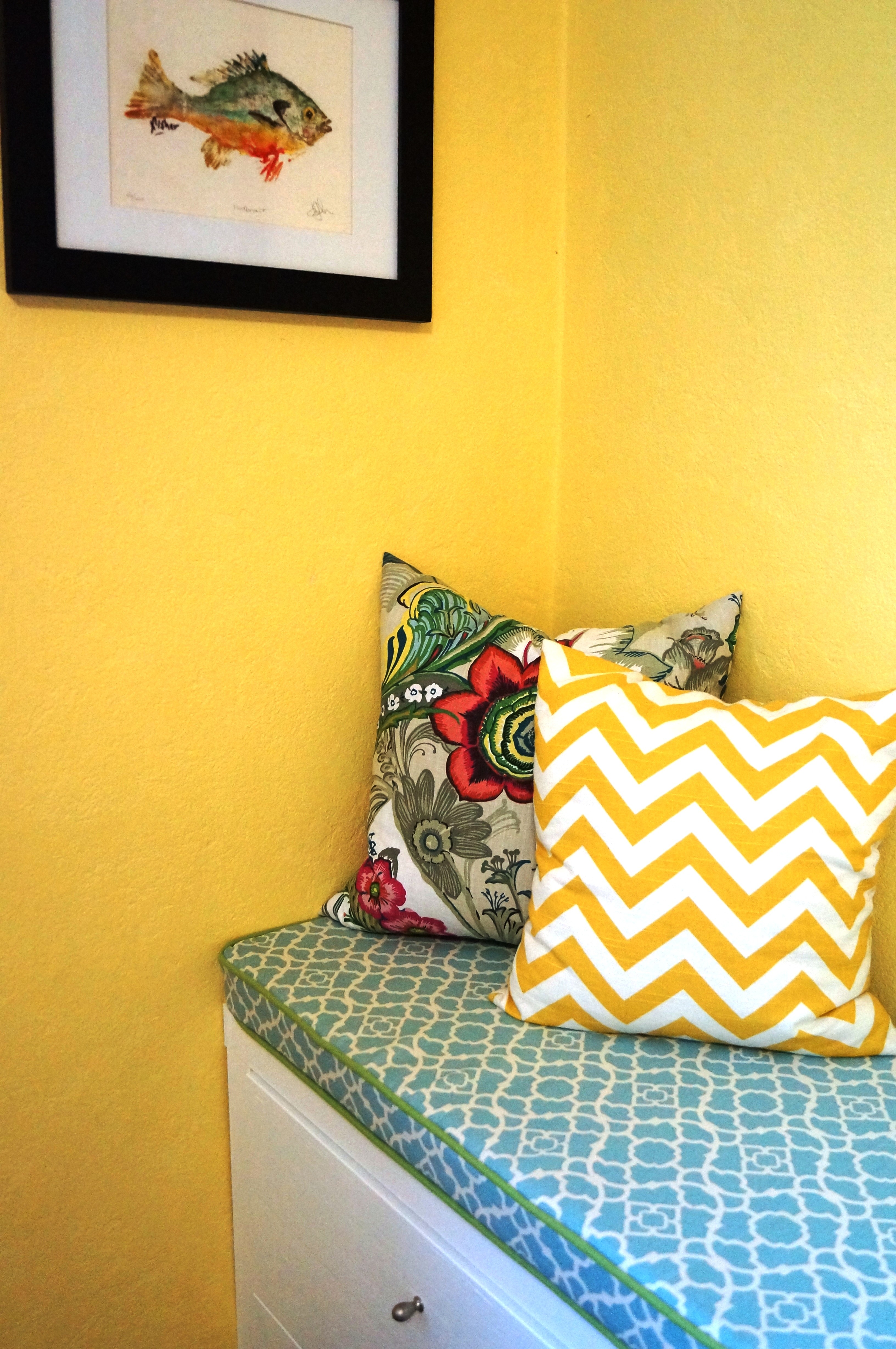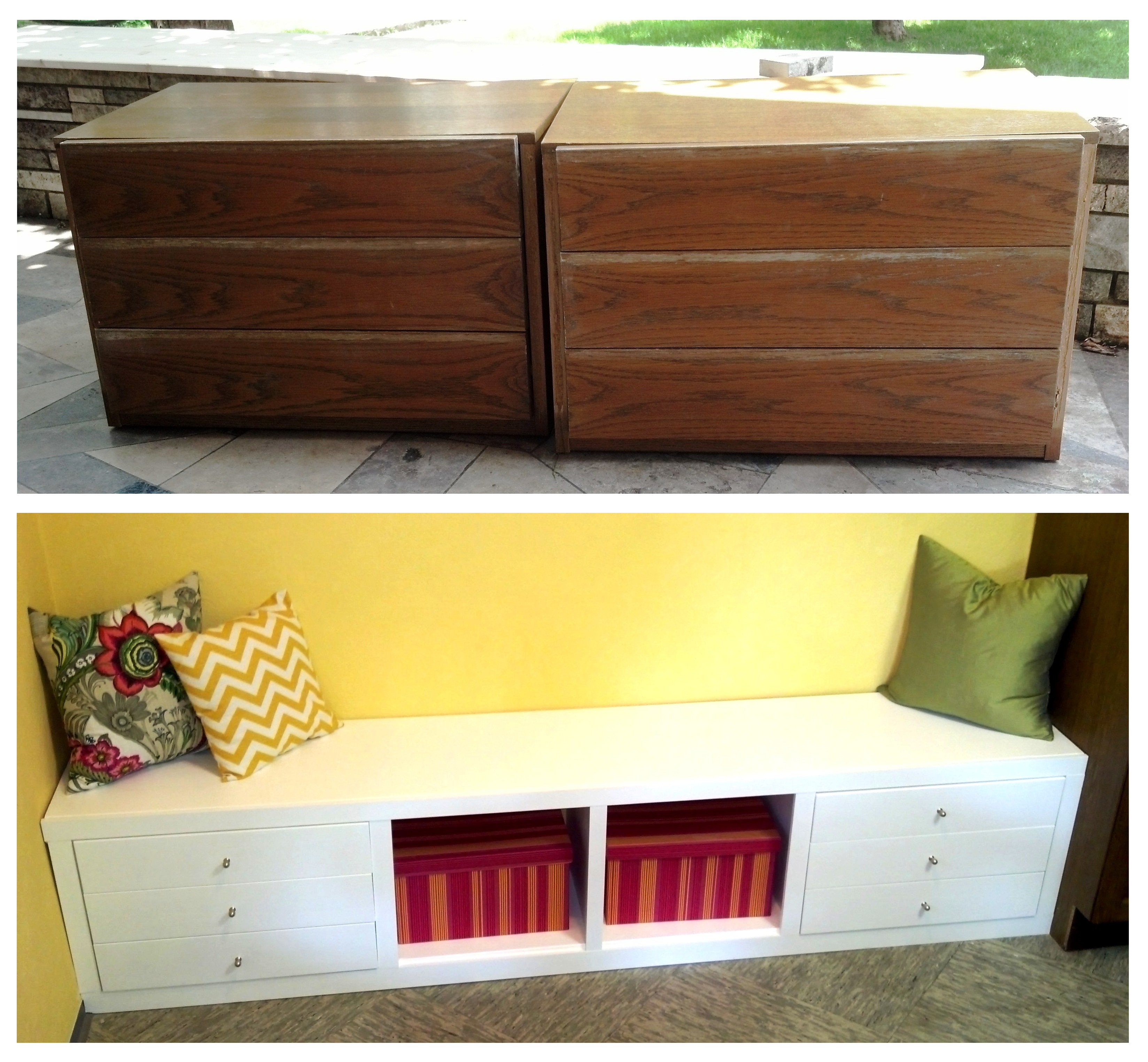 The kitchen also got a few DIY projects. I found a great oak double pedestal table at the thrift store (the movers dropped my table off the truck so it had to be replaced,) I decided to paint it white since I already had my quota of wood with the cabinets. I also decided I had room for more seating with a banquet. I saved time building this by using two night stands as the base and with just a few basic straight cuts on all the additional wood and I get six more drawers and some basket storage. Oh the joy!