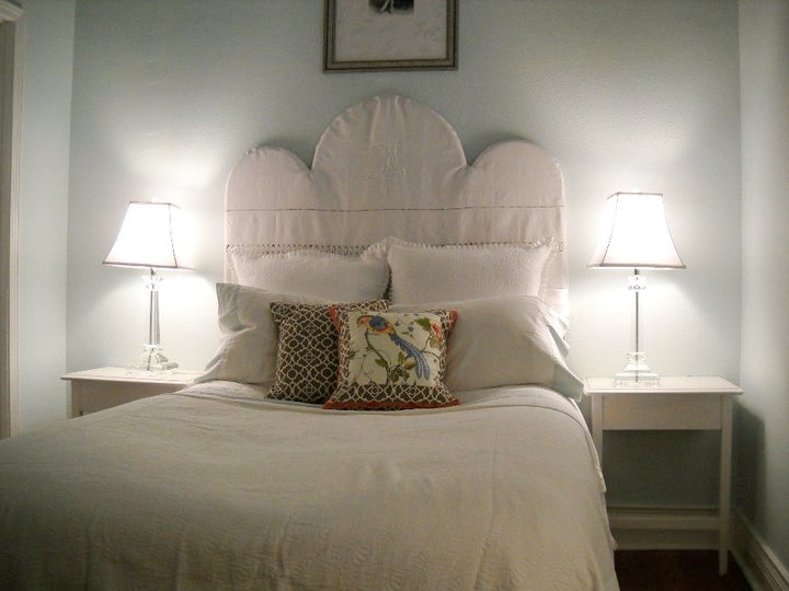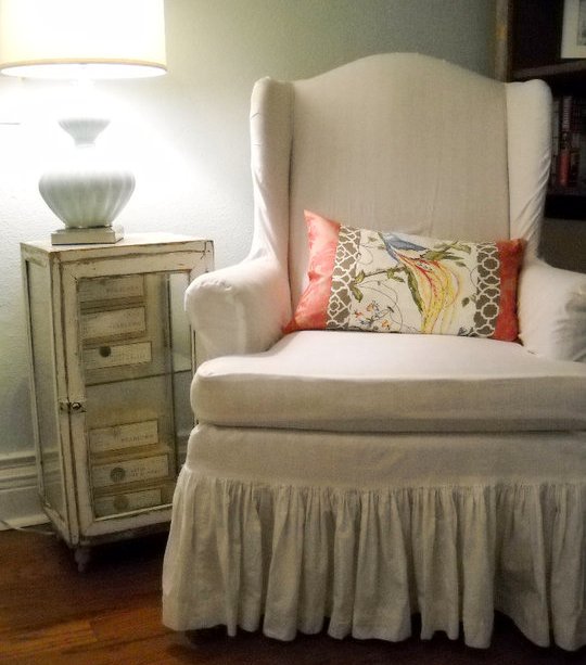 - You can use them on anything. Don’t feel like you can only use slip covers on upholstery. Try them on headboards, dining chairs, coffee tables, any where you have something to hide or want to add a little color. This pretty headboard slipcover I made out of a vintage monogrammed sheet.