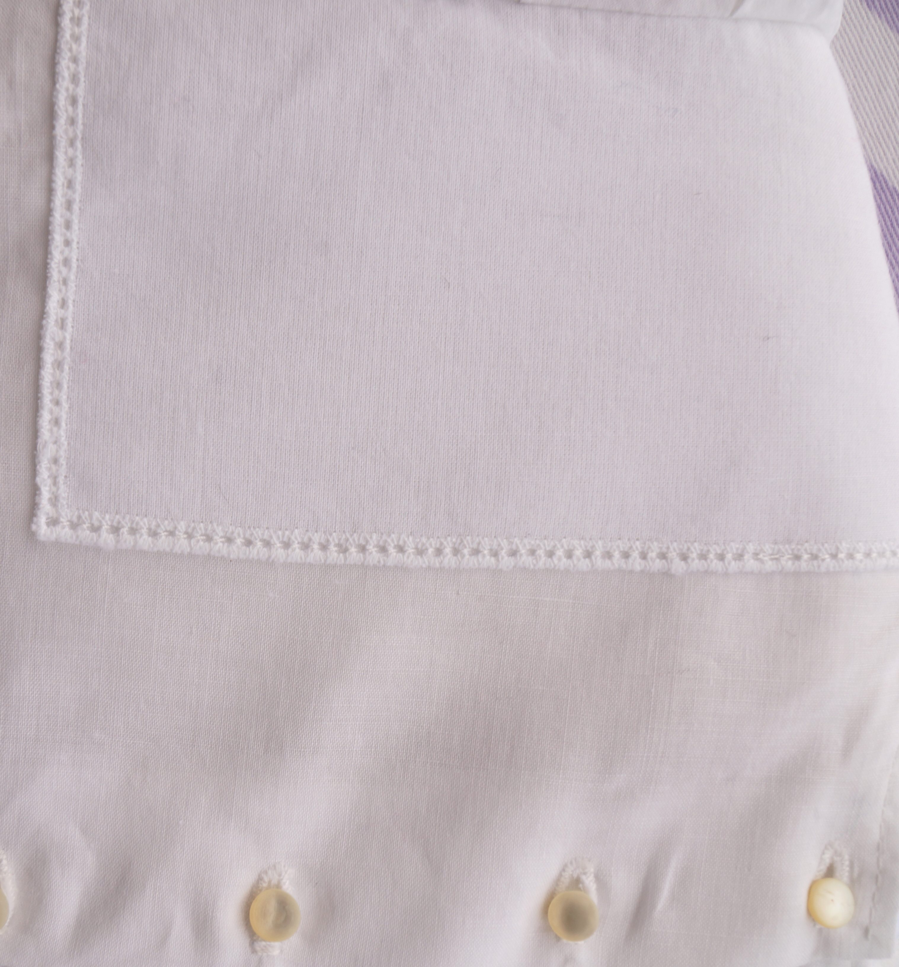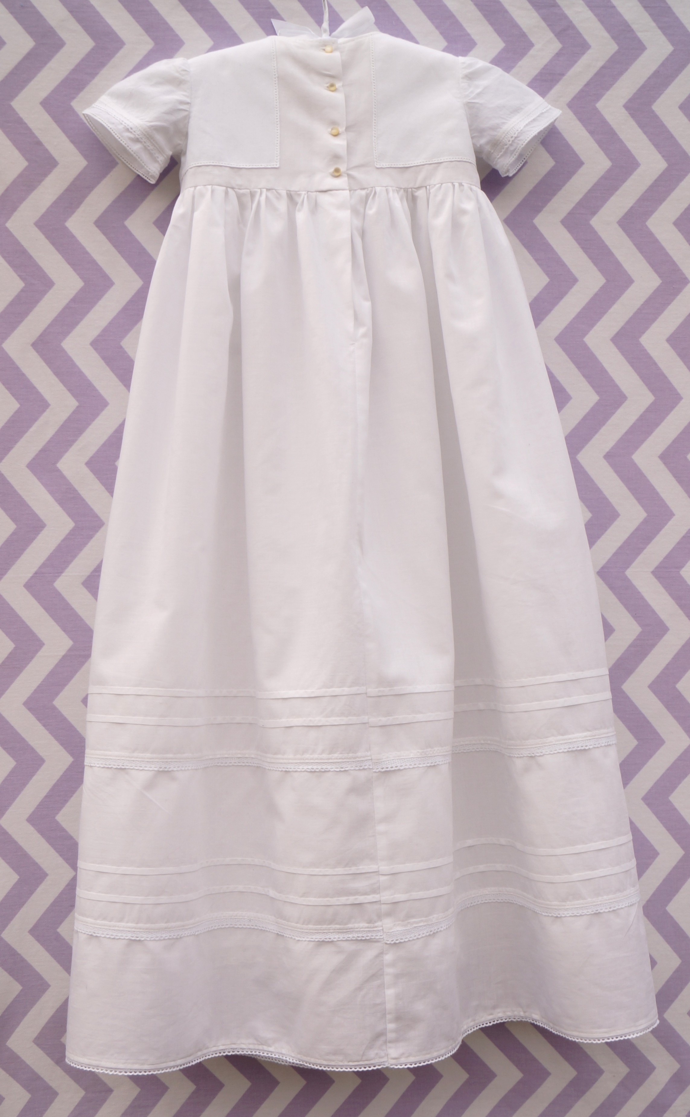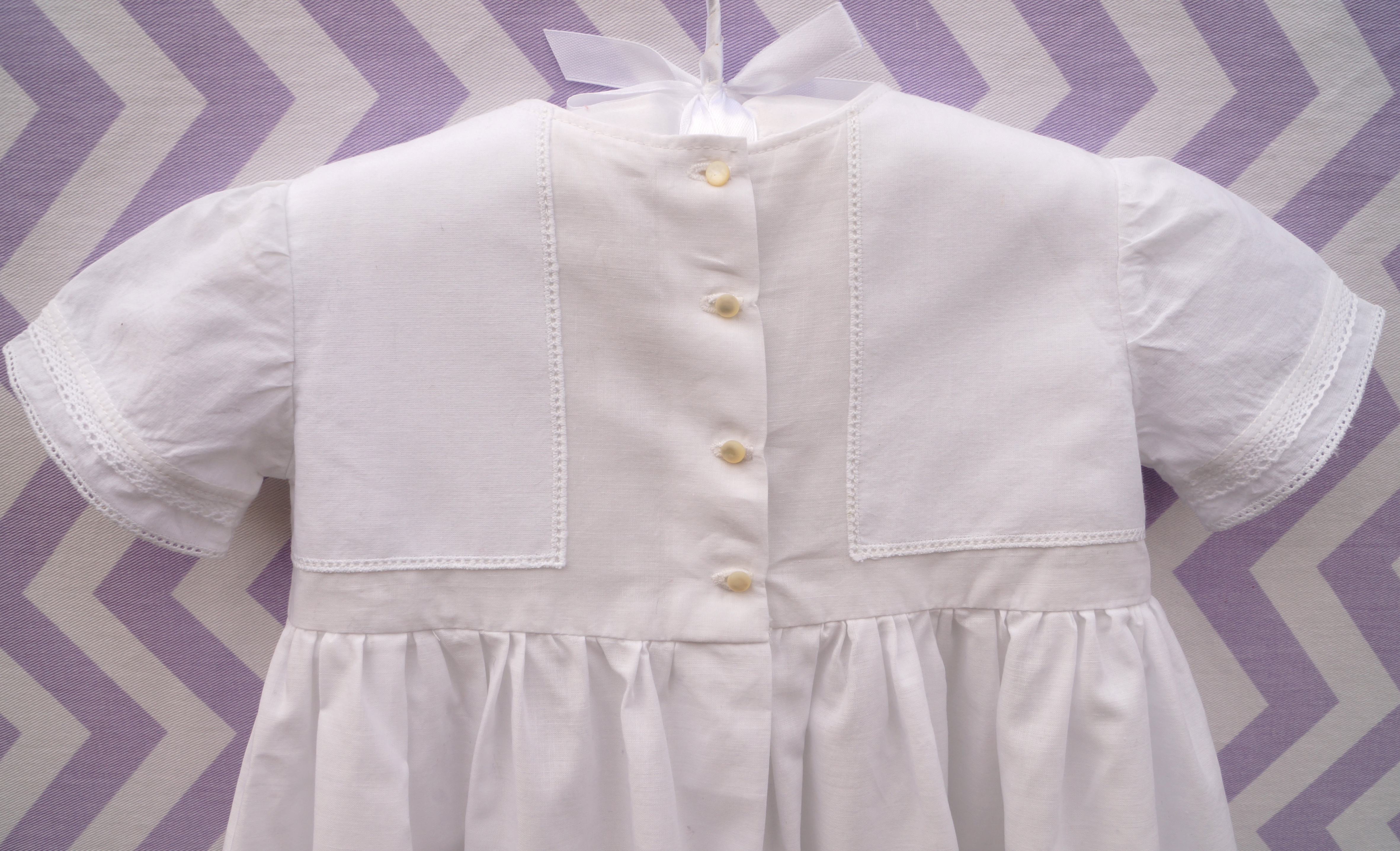 With my handkerchief and lace for embellishment all I needed was to add a series of pin tuck pleats to the lower third of the skirt and one on each sleeve which created a great place to inset my lace. On the back I added vintage buttons to the closure.