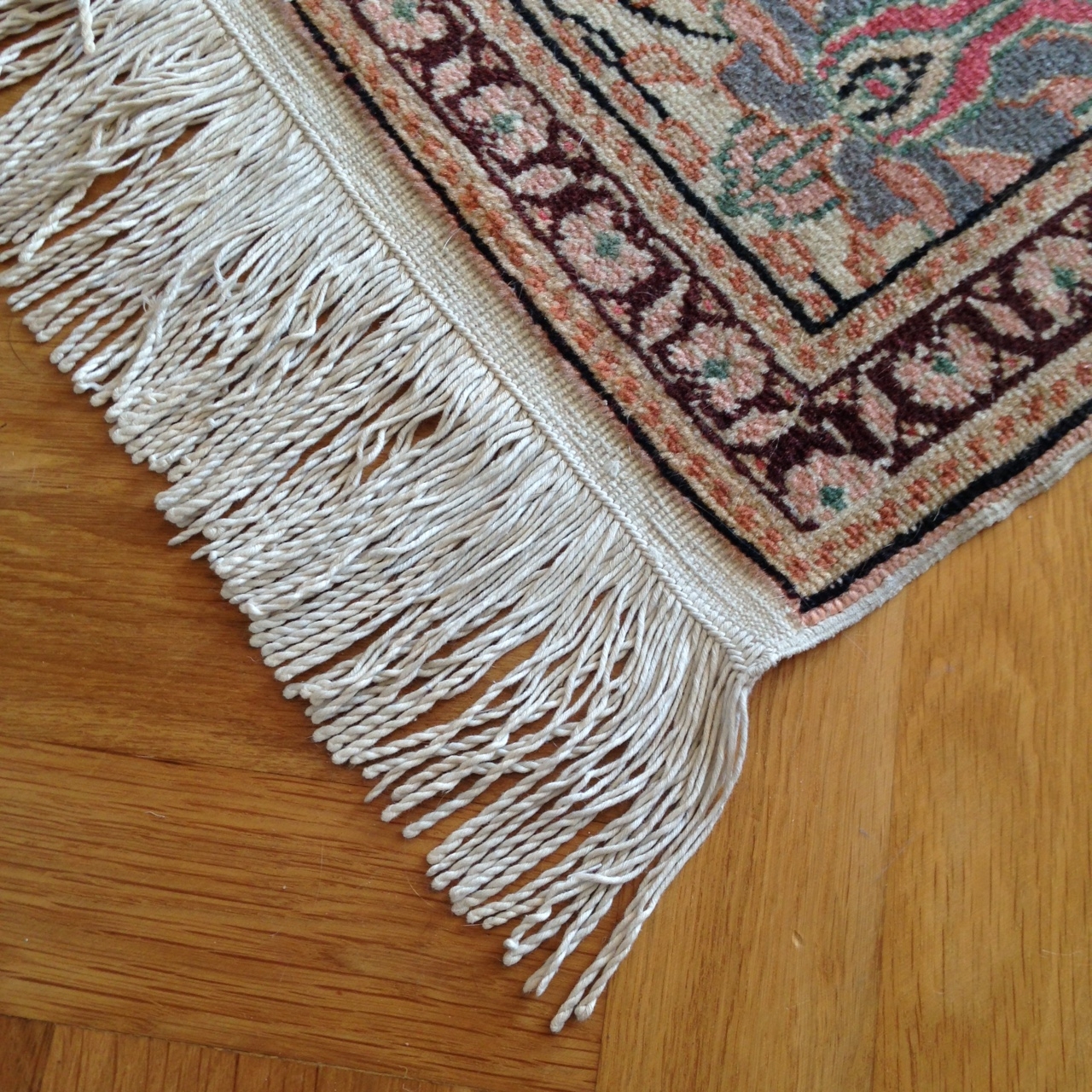 I’m sure you remember my new(old) rug from my master bedroom post and as much as I love it, there is one little problem. After having the rug a while I noticed that my bare feet kept getting tangled in the fringe on one end, very annoying in the middle of the night in the dark. As I looked closer I noticed that one end of the rug had a twisted tight fringe about 4″ long while the other end (the annoying end) had a 6″ cut fringe that was full of tangles and loose threads.