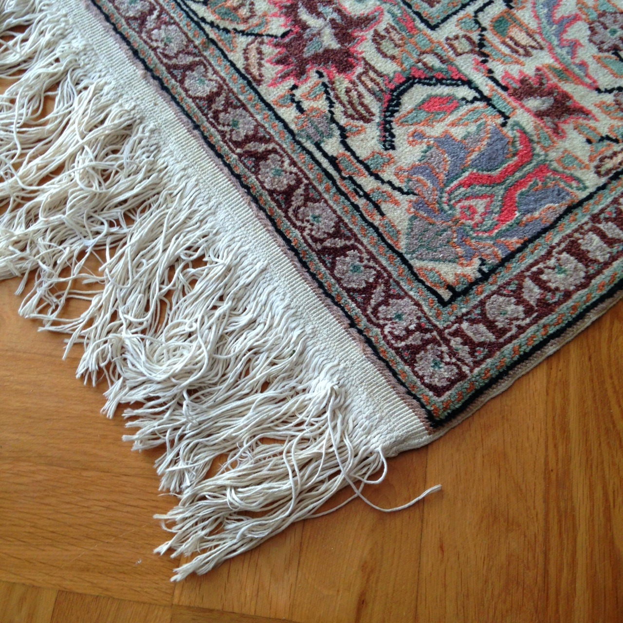 After talking to a rug dealer I learned that the tight end was looped around the loom while the other end was cut once the rug was complete. The biggest problem (other than getting tangled in it every night) is the loose end can begin to unravel over time, if this continues into the rug’s pattern it is very expensive to repair. So I decided I needed to do something about this mess…