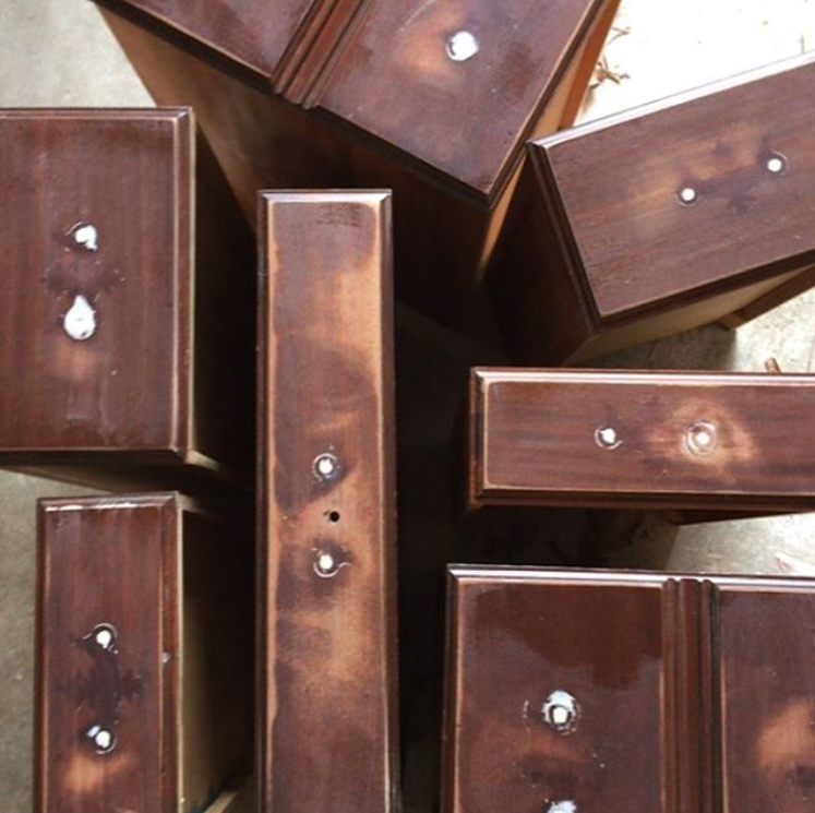 So while I waited for a day with above 50°F temperatures I sanded down the desk filled all the screw hole since I knew I wanted to update the hardware and bought my Krylon CoverMaxx paint in Gum Drop. I am a big fan of spray paint because I love the smooth finish it provides but I admit it is not for everyone.